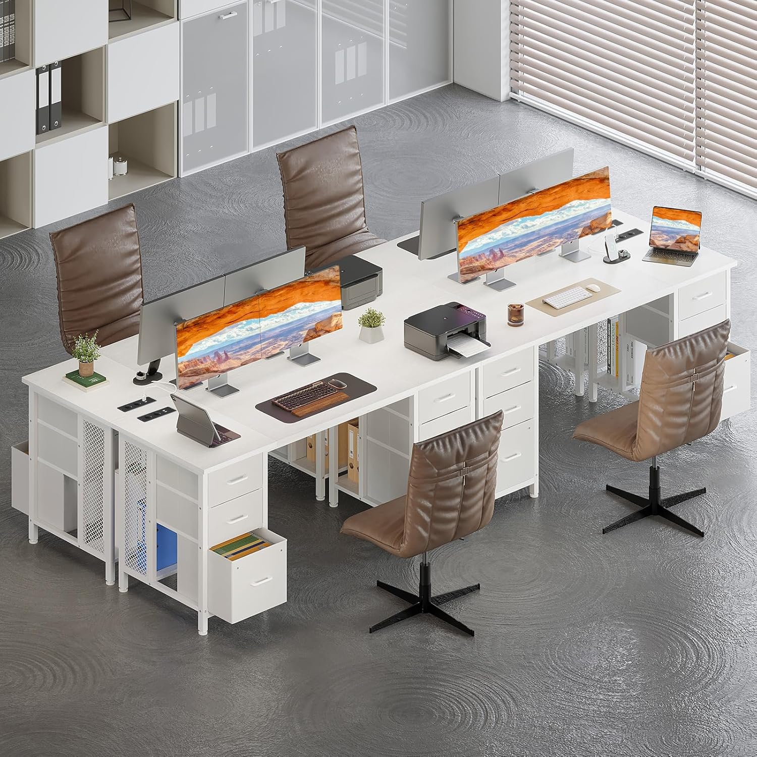 【Rangement et Organisation Spacieux】Le rangement bureau est équipé de deux classeurs et de quatre petits tiroirs pour ranger de manière organisée les fournitures de bureau, les documents et les appareils électroniques. Une étagère située sous le bureau permet de ranger les routeurs, les multiprises et autres accessoires, ce qui vous permet d’aménager l’espace de rangement de manière rationnelle et de garder votre bureau plus ordonné et mieux organisé.