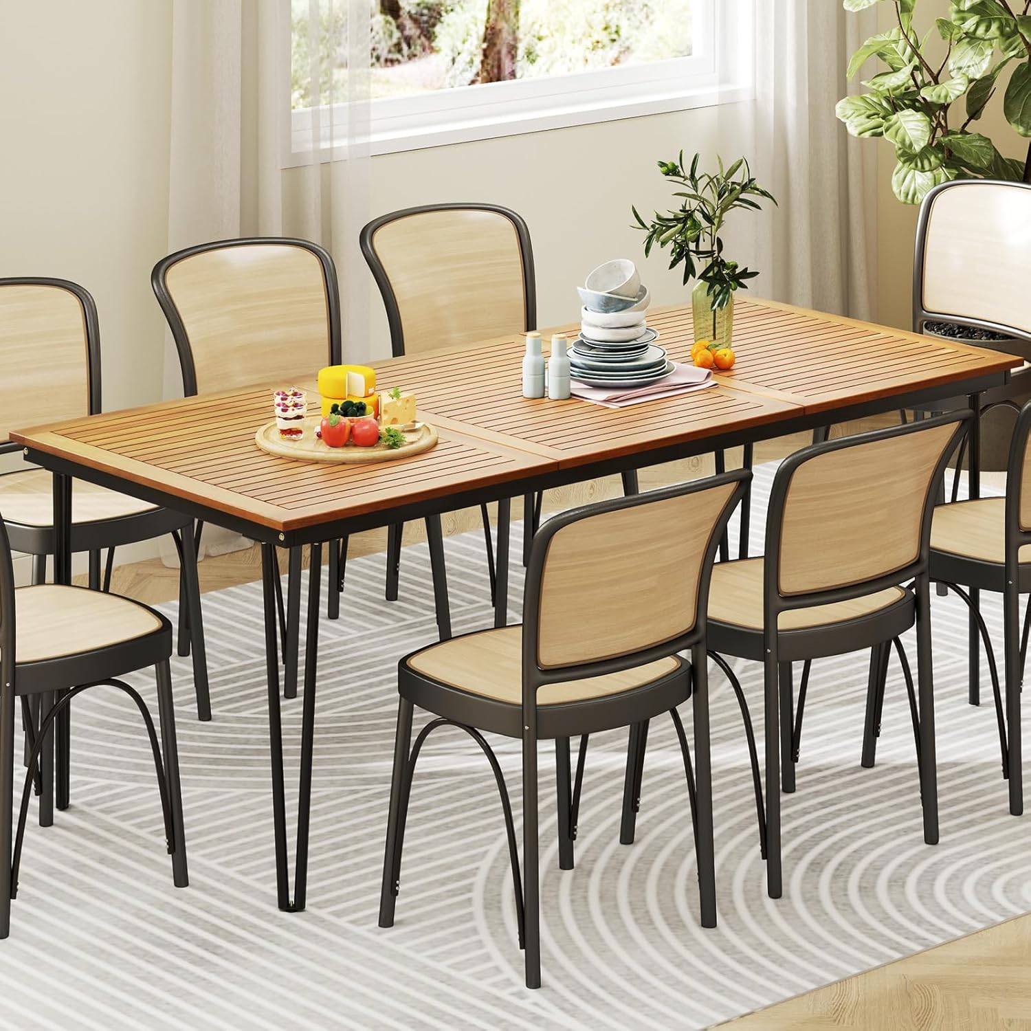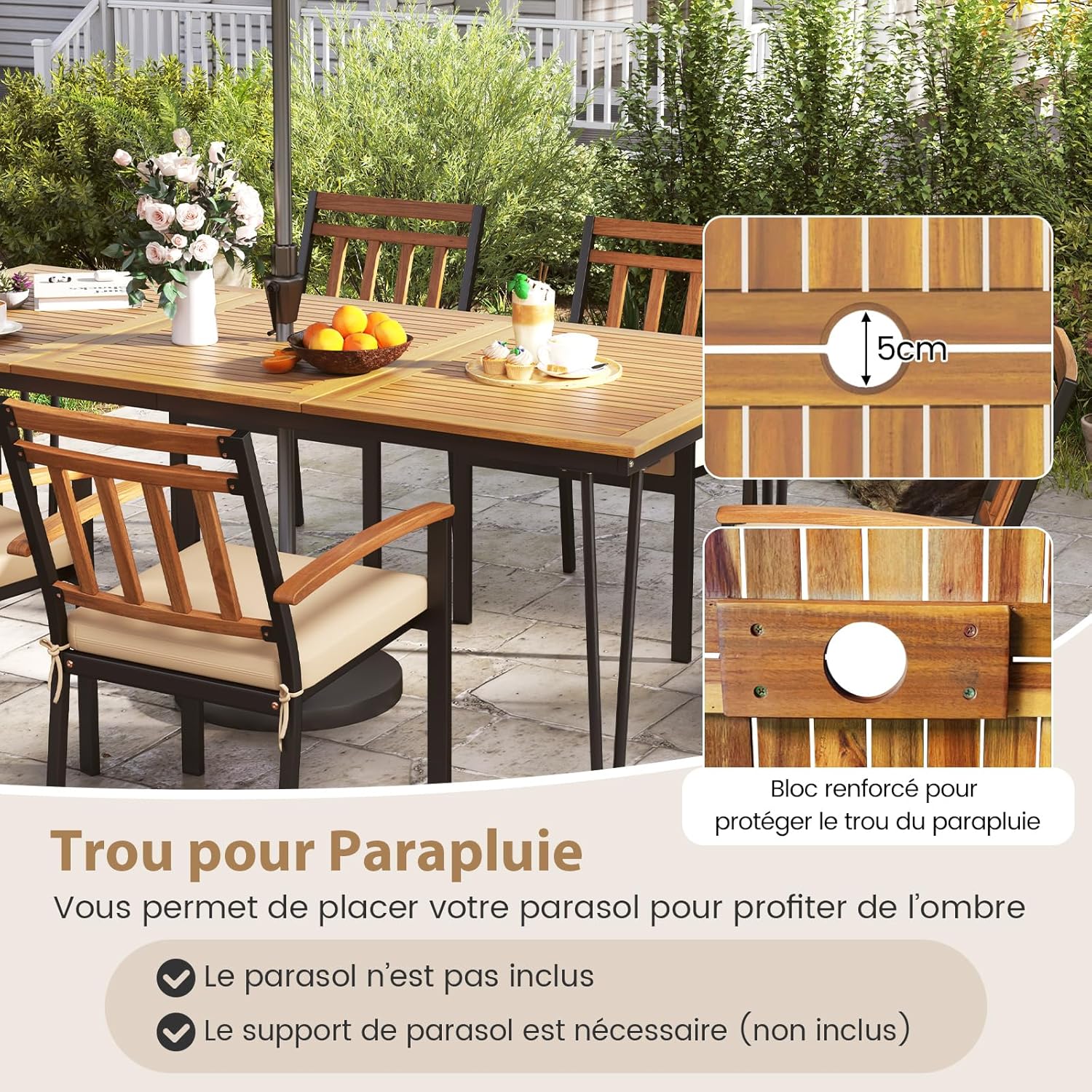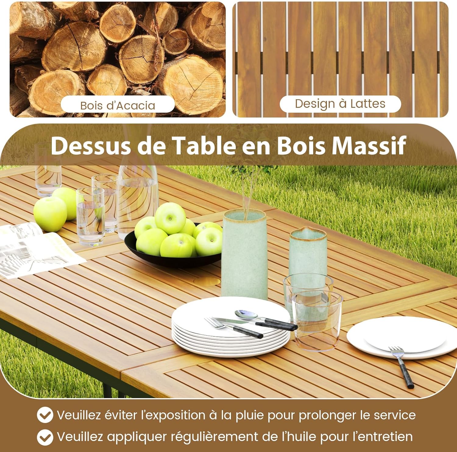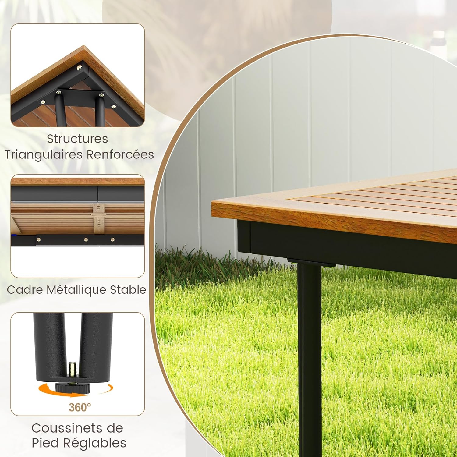 【Plateau en bois d’acacia massif】Dotée d’un plateau en bois d’acacia, cette table de salle à manger d’extérieur allie attrait naturel et durabilité. La conception à lattes évite l’accumulation d’eau, ce qui rend la table pratique pour les environnements extérieurs. Remarque : veuillez appliquer régulièrement de l’huile ou du vernis pour l’entretien.