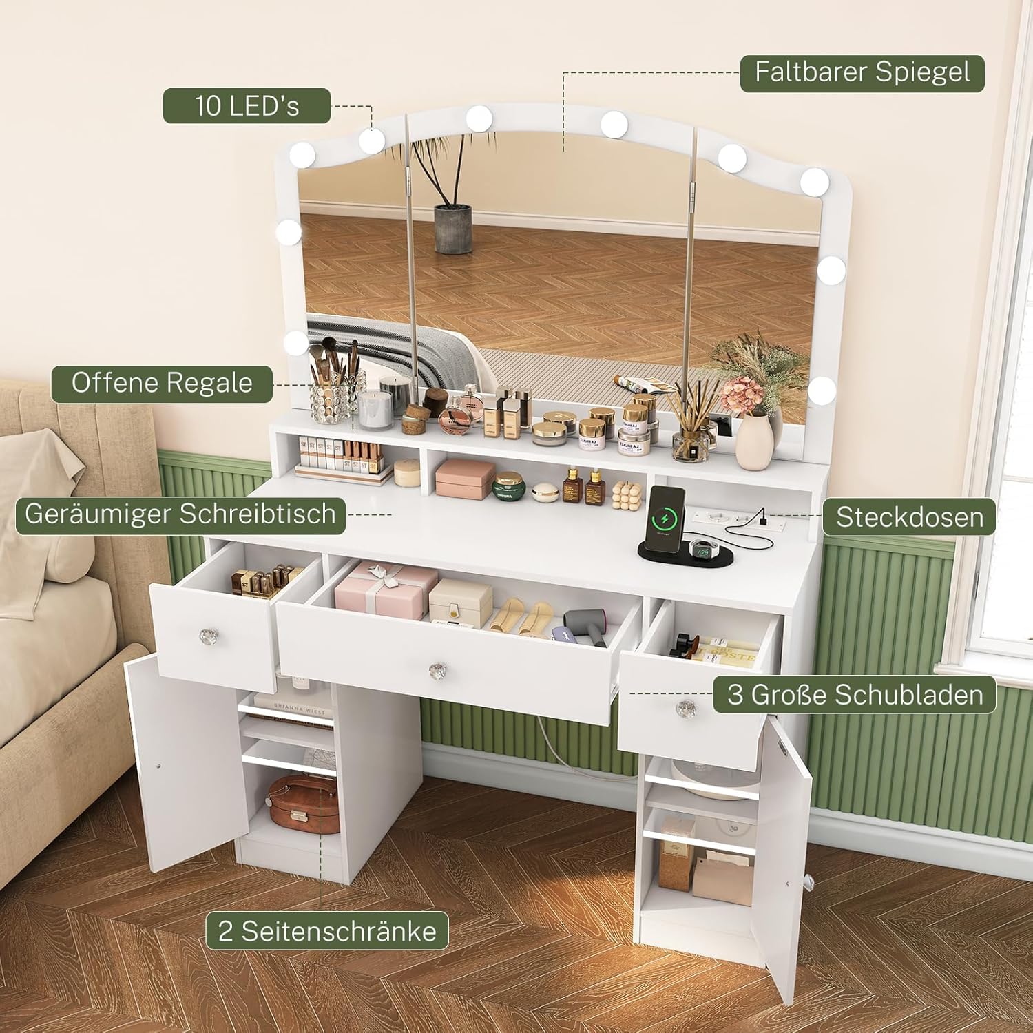 [3 MIROIRS RABATTABLES] La Coiffeuse est équipée de trois miroirs et de trois lumières colorées réglables, illuminant votre beauté à 360°, qu’il s’agisse de maquillage, de soins de la peau ou de coiffure, il est facile de prendre soin de chaque angle