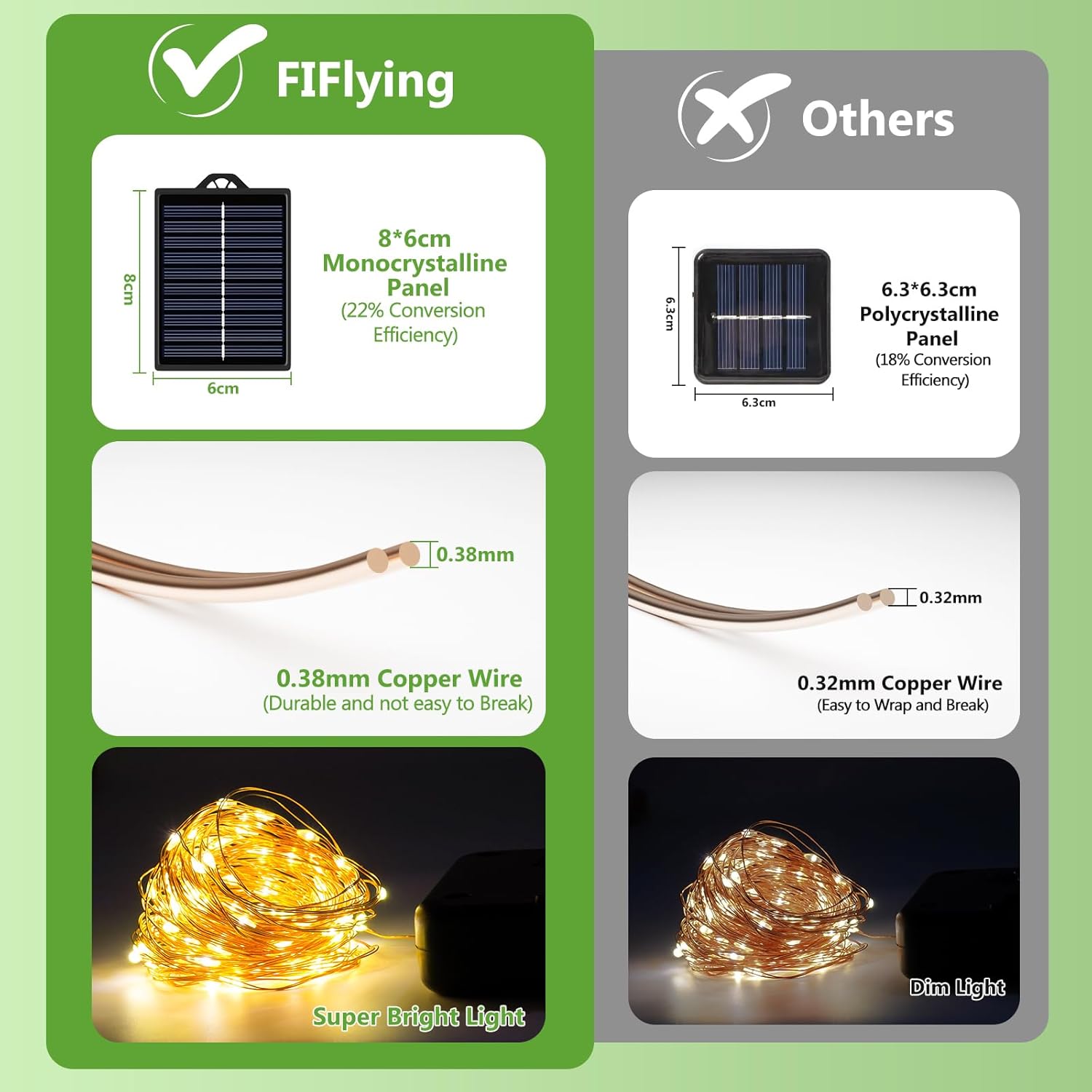 【Nouveau panneau solaire amélioré】La guirlande lumineuse solaire extérieure est équipée d’une d’un panneau solaire monocristallin amélioré, avec une plus grande taille (8 x 6 cm), de meilleures performances et un taux de conversion plus élevé jusqu’à 22 %. Il ne faut que 6 à 8 heures pour se charger complètement sous la lumière du soleil et peut briller pendant 10 à 18 heures la nuit.