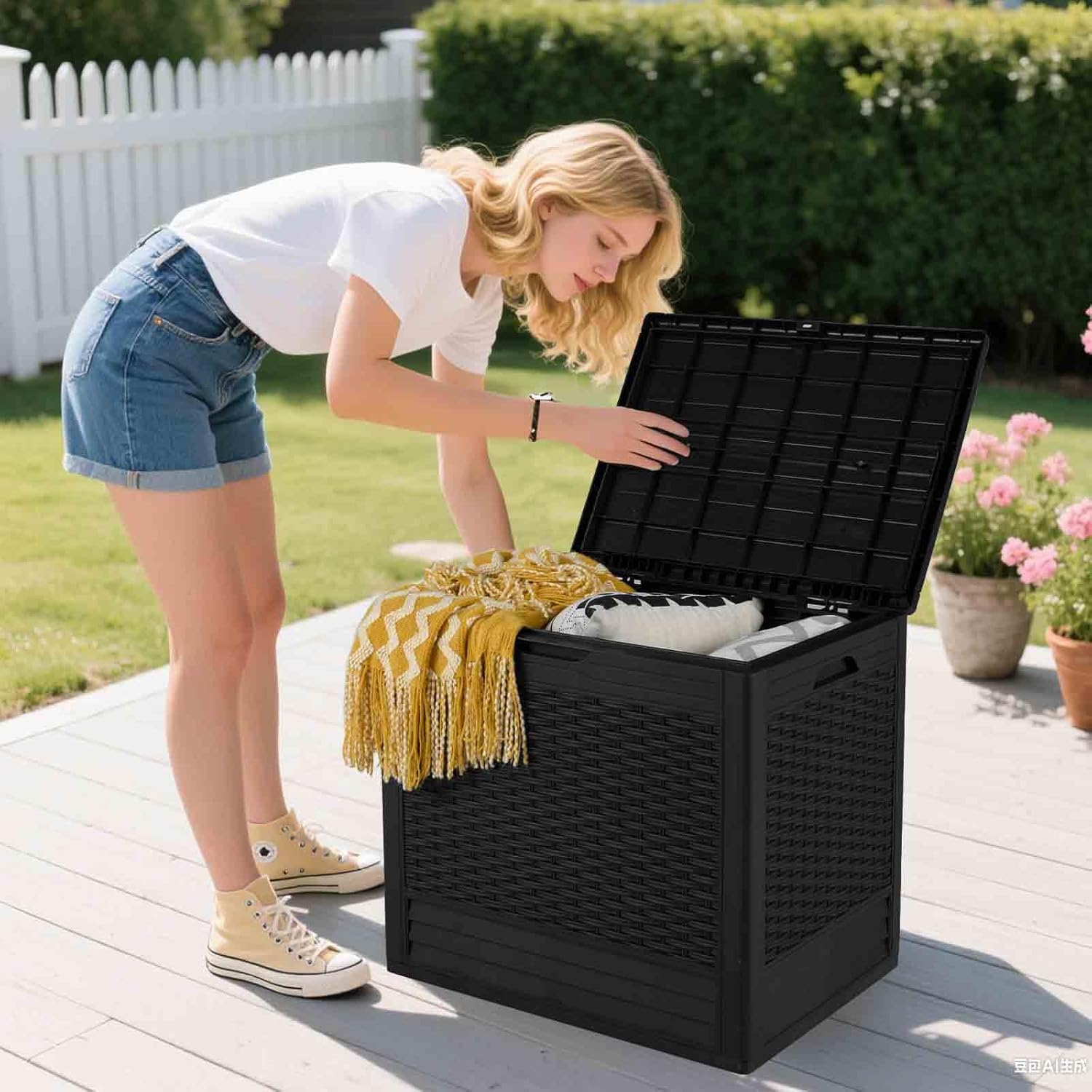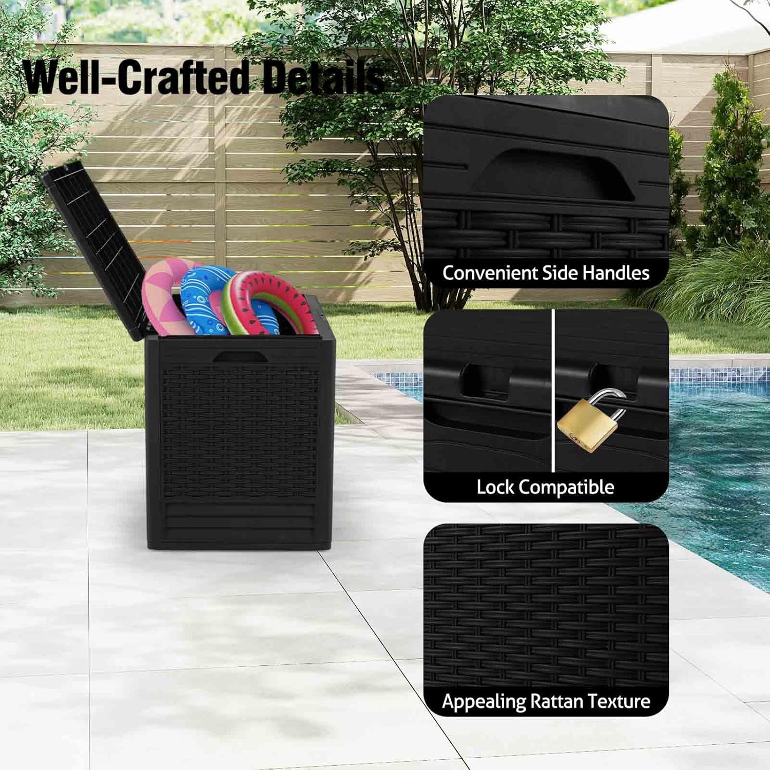 TEXTURE EN ROTIN ÉLÉGANTE : cette boîte de rangement, ornée d’un motif sophistiqué en rotin, offre non seulement une option pratique pour le rangement, mais améliore également l’esthétique de votre espace extérieur. Elle s’adapte parfaitement à différents styles de mobilier de jardin, alliant fonctionnalité et beauté