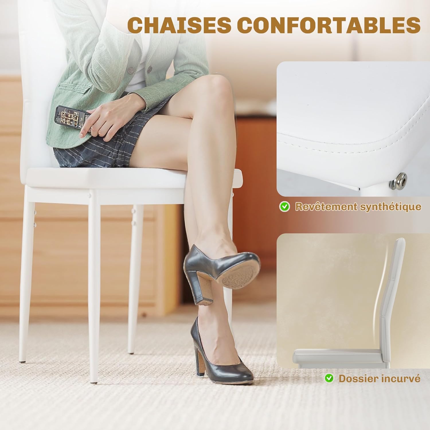 CHAISES DE CUISINE CONFORTABLES : Conçues pour le confort, ces chaises de salle à manger ergonomiques présentent une assise en revêtement de polyuréthane et un dossier haut légèrement courbé, assurant stabilité et confort.
