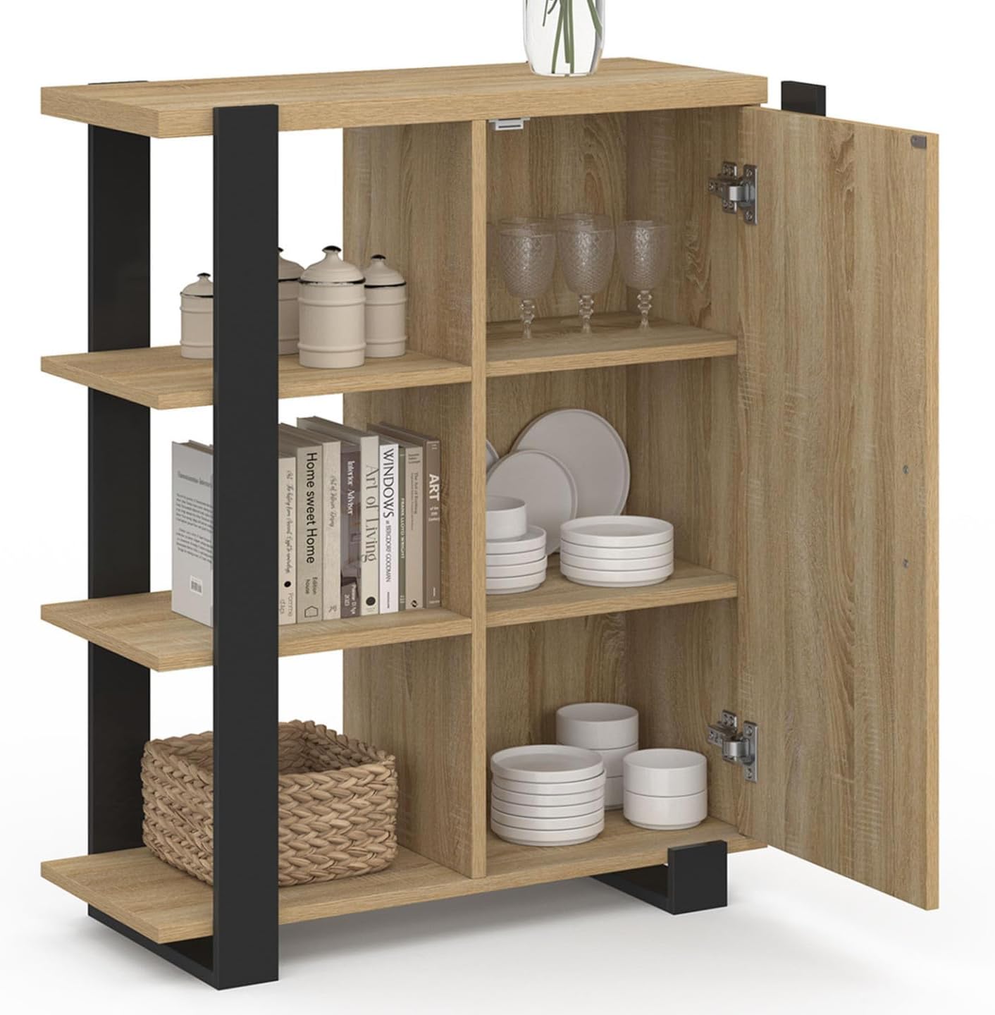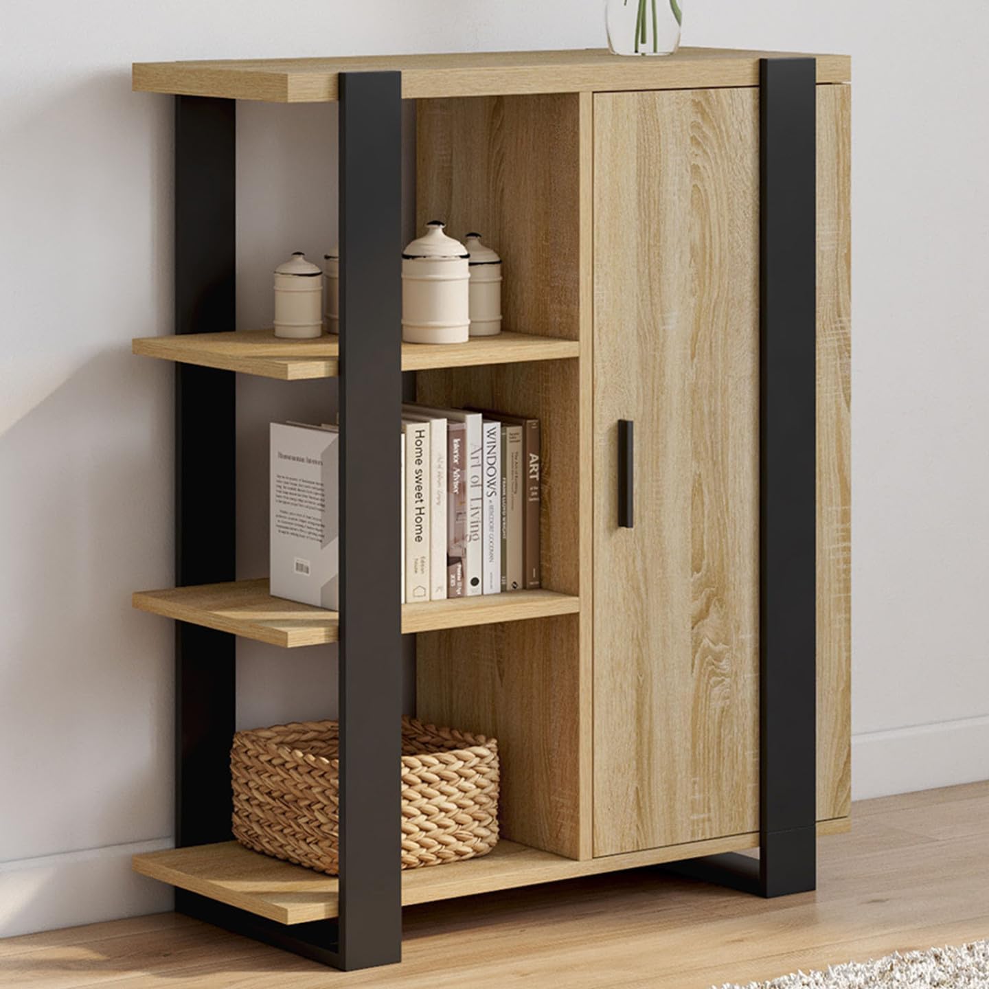 Découvrez le buffet d’appoint 3 étagères avec placard PHOENIX bois et noir ! Doté de multiples rangements, il mettra en valeur vos objets déco tout en gardant votre pièce bien ordonnée !Bicolore, ce meuble de rangement au style industriel s’adaptera facilement aux différentes pièces de votre maison quel que soit votre intérieur grâce à ses coloris sobres bois et noir.Un placard muni de 2 étagères vous offrira un espace de rangement fermé pour conserver vos affaires à l’abri de la poussière et des regards. Modulez les étagères selon vos besoins, en les réglant sur l’une des 3 positions possibles !Exposez vos plus beaux objets déco sur les trois étagères latérales ouvertes ! Vous pouvez également utiliser le dessus du meuble pour disposer vide-poche, lampe ou encore petite plante verte.Avec ses multiples rangements et ses dimensions compactes, utilisez ce meuble gain de place dans une cuisine, une entrée, un salon, un bureau ou même une chambre comme bibliothèque d’appoint !Sa structure en panneaux de particules de bois lui assure stabilité et robustesse tout en participant à son look loft tendance.Optez pour le design industriel malin avec ce buffet d’appoint PHOENIX !Dimensions du buffet d’appoint 3 étagères et placard 70 cm PHOENIX bois et noirDimensions globales : Longueur 70 cm x largeur 30 cm x Hauteur 85 cmDimensions d’une étagère : L. 34.5 x l. 27 x H. 24.5 cmDimensions de la porte placard : L. 34 x H. 75.5 cmHauteur au sol : H. 5 cmLongueur des pieds : L. 6 cmDimensions de la poignée : l. 2 x H. 11 cmMatériaux : panneaux en particules de bois (PB)À monter soi-mêmeRetrouvez l’ensemble de nos buffets industriels sur notre boutique en ligne !