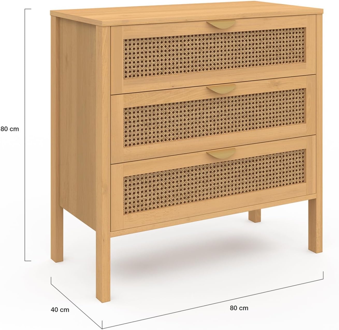 Optez pour cette commode 3 tiroirs EDHEN et apportez une touche naturelle et exotique à votre intérieur. Grâce à ses tons naturels, cette commode se mariera parfaitement avec tous types de décoration pour apporter chaleur et modernité à votre intérieur. Installez-la aussi bien dans votre chambre à coucher, votre dressing ou même votre bureau. Sa capacité de rangement optimal vous permettra d’organiser tous vos vêtements et d’y ranger même les linges plus volumineux, tout en étant à l’abri de la poussière et de l’humidité. Profitez dès à présent de ses larges tiroirs, dotés de façades en bois et cannage synthétique, pour ranger tous vos pulls, votre linge de lit et vos serviettes de bain les plus encombrantes. De plus, ses 4 pieds de 17,5 cm de hauteur, sa structure en panneaux de particules et ses façades de tiroirs en bois naturel lui assurent stabilité et robustesse au quotidien.Cette commode au style très tendance, avec ses façades en cannage synthétique et sa structure au coloris bois deviendra une pièce forte de votre chambre à coucher et rendra l’atmosphère décontractée ! Alors n’hésitez plus et optez pour la commode EDHEN 3 tiroirs au look ultra tendance ! Dimensions de la commode 3 TIROIRS EDHEN Dimensions globales : Longueur 80 cm x largeur 40 cm x Hauteur 80 cmDimensions des tiroirs : 74.5 x 19.5 cm Dimensions intérieures des tiroirs : 70 x 28.5 x 17 cm Hauteur des pieds : 17.5 cm Dimensions des pieds : 2.5 x 4 cm Longueur des poignées : 10 cm Matériaux : Panneau de particules, MDF et cannage synthétique Coloris : Bois À monter soi-mêmeRetrouvez toutes nos commodes sur notre boutique en ligne.