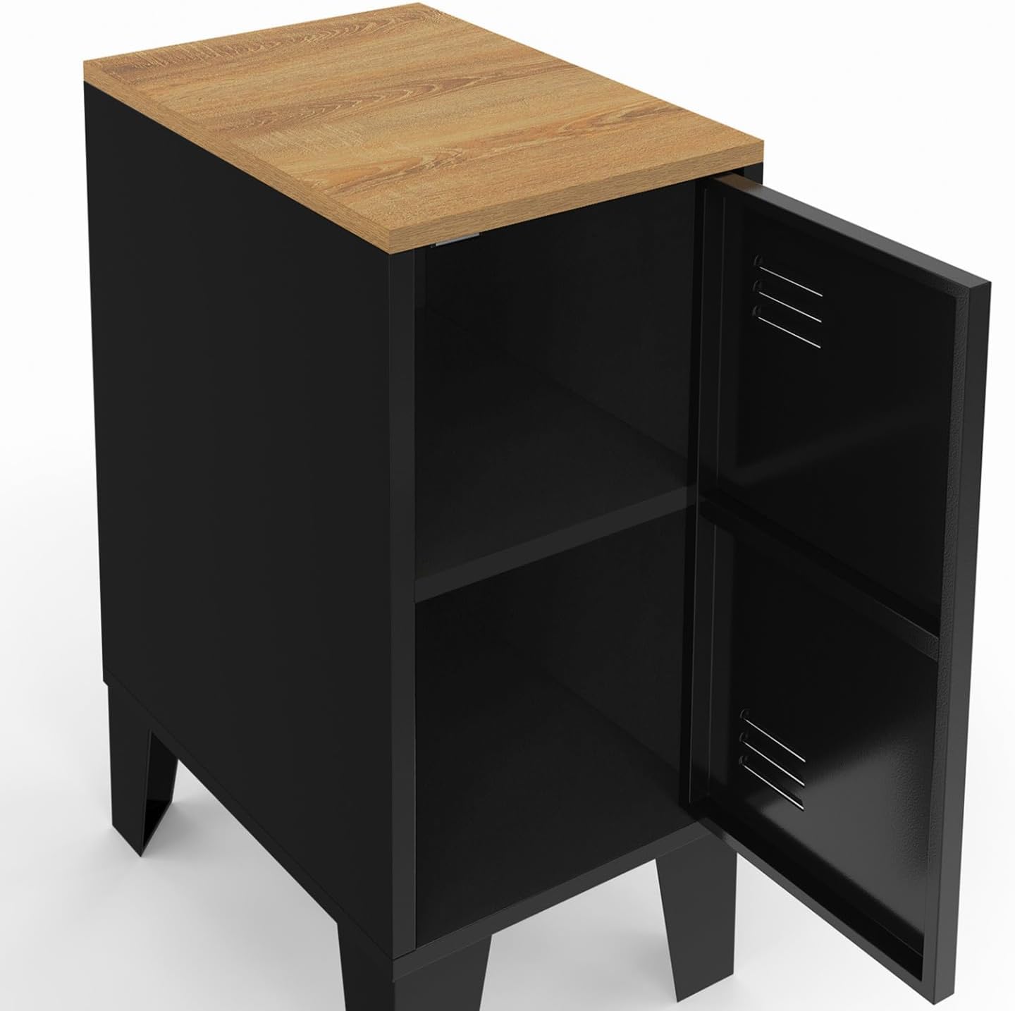 À la recherche de tables de chevet au look industriel ? Optez pour ce lot de 2 tables de chevet ESTER métal noir et plateau bois façon hêtre 1 porte. Ce meuble d’appoint est l’élément indispensable à intégrer dans votre chambre à coucher pour un rangement optimal ! Son design industriel aux lignes épurées apportera une véritable touche d’originalité !Sa couleur noire classique et intemporelle associée à son plateau façon hêtre chaleureux permet à cette table de chevet de s’accorder à n’importe quelle décoration intérieure, pour un look sobre et élégant. Pratique et fonctionnelle grâce à ses dimensions compactes, profitez de sa porte pour y ranger toutes vos affaires personnelles à l’abri des regards tout en les ayant à portée de main. Cette table de chevet vous permet ainsi une meilleure organisation de vos affaires et vous offre une belle capacité de rangement ! Utilisez son plateau pour y déposer votre réveil, une jolie bougie ou tout autre élément de décoration. Alors n’attendez plus et craquez pour le chevet ESTER façon hêtre et métal noir, pour une touche industrielle dans votre intérieur ! Dimensions des tables de chevet ESTER façon hêtre et métal noirDimensions globales : Longueur 20 cm x Largeur 30 cm x Hauteur 50 cmDimensions de la porte : L. 17 x H. 37 cmDimensions du placard : L. 17,5 x l. 28,5 x H. 37,5 cm1 étagère ajustableHauteur des pieds : 10 cmMatériaux : panneaux de particules de bois (PB) et métalColoris : noir et boisÀ monter soi-mêmeRetrouvez d’autres formats et compositions de nos chevets ESTER :- Lot de 2 chevets ESTER 1 tiroir avec niche noir et bois- Table de chevet ESTER 1 porte noire et bois- Table de chevet ESTER 1 porte blanche et bois- Table de chevet ESTER 1 porte noire- Table de chevet ESTER 1 porte bois et noir- Table de chevet ESTER 1 porte griseDécouvrez également tous nos meubles de la collection métal sur notre boutique en ligne.