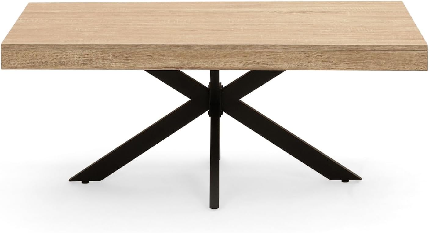 Le design industriel s’invite dans votre salon avec cette table basse ALIX 110 cm bi-matière !Sa structure en bois et son pied central spider en métal noir s’associent pour un look façon loft et un esprit chaleureux qui se marieront parfaitement avec votre décoration intérieure.Son long plateau de 110 cm de longueur très pratique en panneaux de particules de bois (PB épaisseur 1,5 cm) est idéal pour un apéro convivial en famille ou entre amis. Le rebord de 7 cm de hauteur autour du plateau lui confère quant à lui une allure massive des plus esthétiques. Son pied araignée en métal noir lui apporte une touche d’originalité et lui assure solidité et stabilité.Au-delà de son côté authentique et robuste, ses proportions compactes en font une table fonctionnelle.Optez pour le style industriel moderne et craquez pour la table basse ALIX 110 cm !Dimensions de la table basse ALIX 110 cmDimensions globales : Longueur 110 cm x largeur 60 cm x Hauteur 45 cmMatériaux : plateau en panneaux de particules de bois (PB) épaisseur 1,5 cm et pied central en métal Épaisseur des pieds : 2,5 cm x 5 cm Épaisseur du plateau : 7 cm Coloris : bois et noir À monter soi-mêmeCe modèle est également disponible en table basse ronde.Retrouvez l’ensemble de la gamme ALIX et l’intégralité de notre collection industrielle sur notre boutique en ligne !