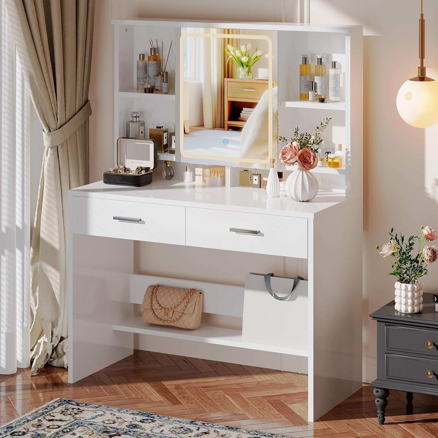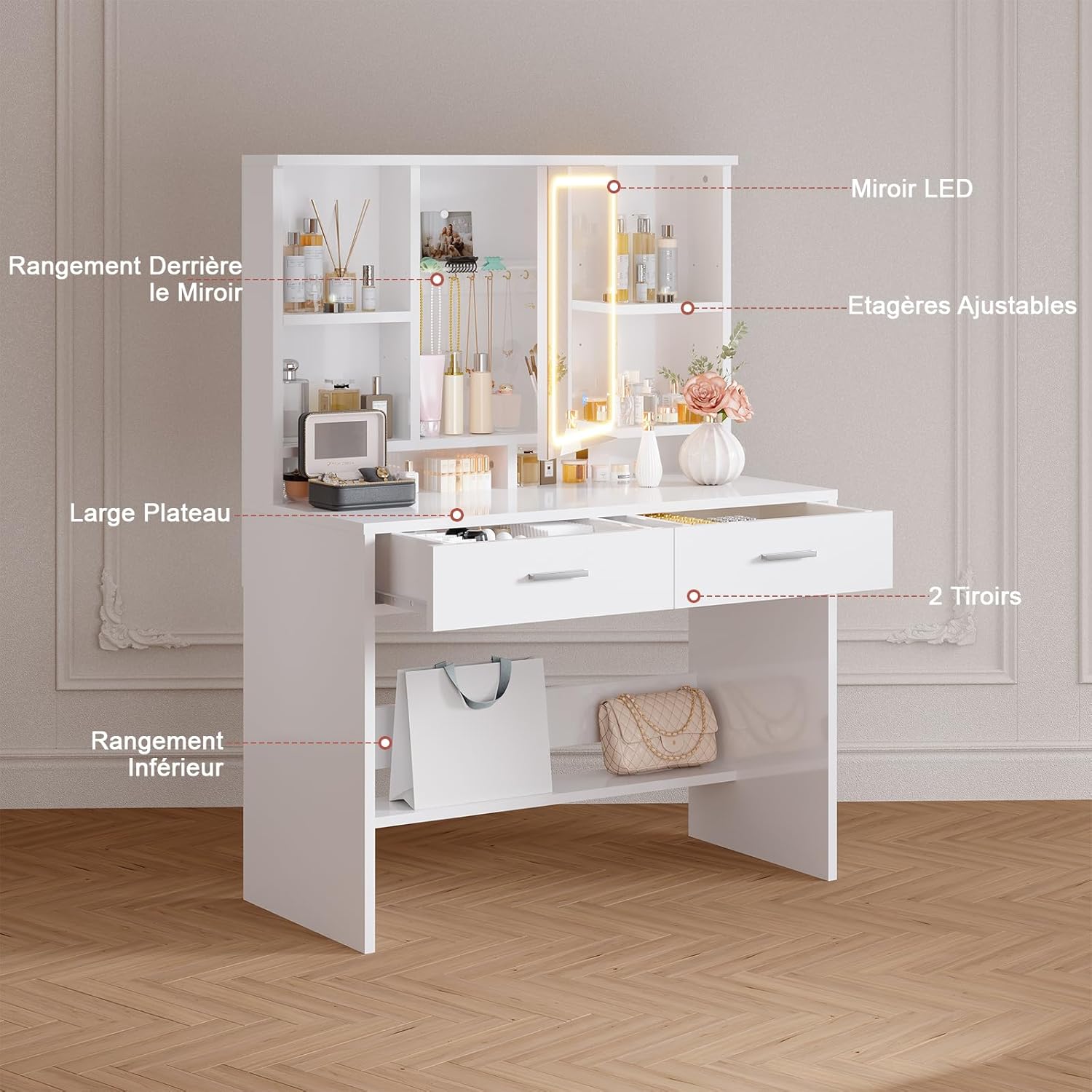 【Étagères réglables】L’espace de rangement inférieur est équipé de 2 tiroirs, et la surface spacieuse de la table offre un espace supplémentaire. Les étagères réglables côtés miroir permettent de personnaliser l’espace selon la hauteur des flacons et des produits, pour un rangement sur mesure