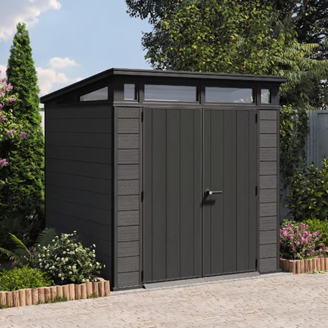 Des fenêtres supérieures et latérales pour plus de lumière et de circulation d’air, des renforts en acier, des portes doubles verrouillables (serrure non incluse), un toit pouvant supporter une charge de neige allant jusqu’à 200 kg, et un design épuré, le Cortina 77 est le nec plus ultra des abris de jardin modernes.