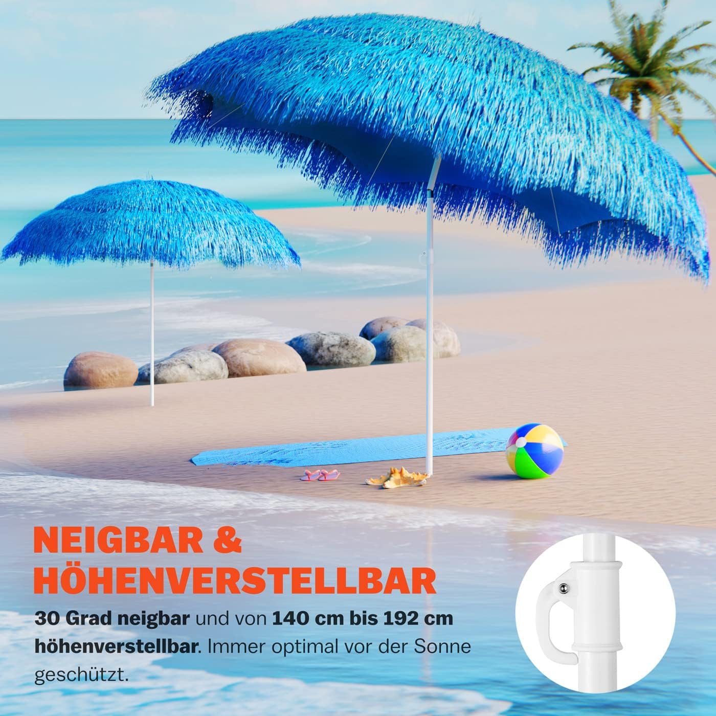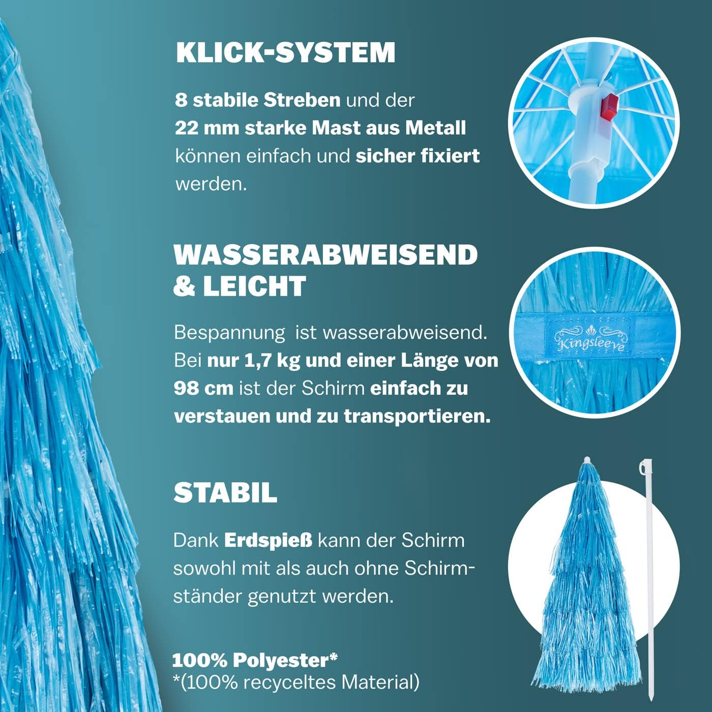 AIR DE VACANCES : Le parasol hawaïen de KINGSLEEVE amène une ambiance de vacances en un rien de temps. Son diamètre de 160 cm offre une protection optimale contre le soleil et vous permet de profiter pleinement de votre journée à l’extérieur, que vous soyez en vacances à la plage, dans le jardin ou sur votre balcon.