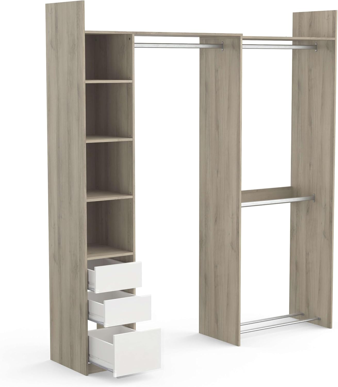 OPTIMISATION DE L’ESPACE : Haut de 2m18 votre kit dressing extensible possède 3 barres de penderie qui offrent une belle capacité de rangement. De plus, les 3 tiroirs passe-main exploitent la profondeur totale du kit dressing pour bien utiliser l’espace