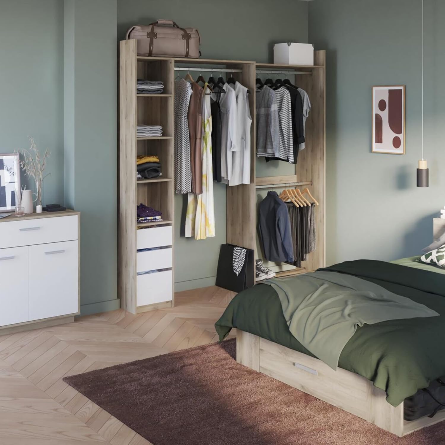 DESIGN : Le bois clair de ce kit dressing s’associe à un blanc mat afin de créer un effet bicolore qui apportera une touche de modernité à vos intérieurs. Grâce à son design simple, votre dressing ouvert s’accordera à une déco scandinave ou contemporaine