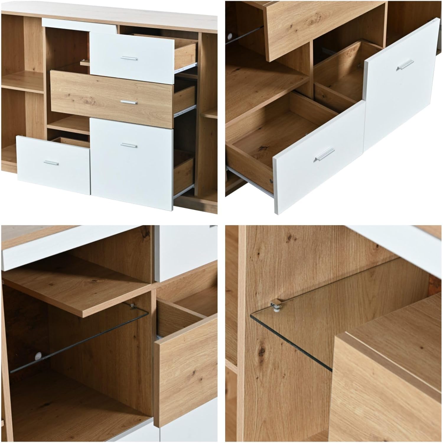 Espace de rangement spacieux et design bien pensé : ce buffet moderne de 160 x 40 x 77 cm est équipé de 2 portes et de 4 tiroirs et offre beaucoup d’espace de rangement. Son aspect bois combiné à des tons blancs montre un goût naturel et rustique sans perdre son style moderne et minimaliste, ce qui en fait un choix idéal pour les meubles de salon et peut être utilisé comme armoire de rangement, commode ou vitrine multifonctionnelle.