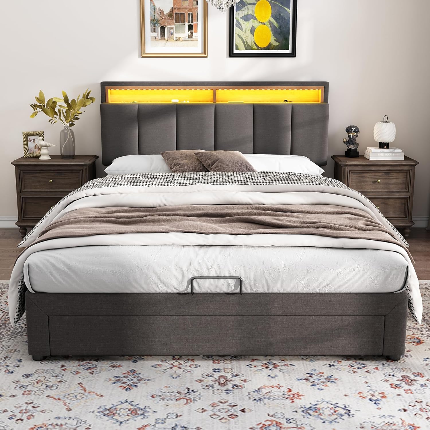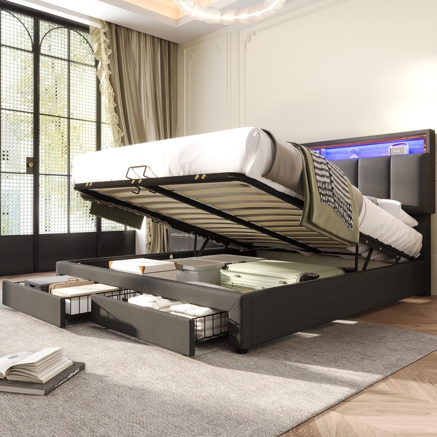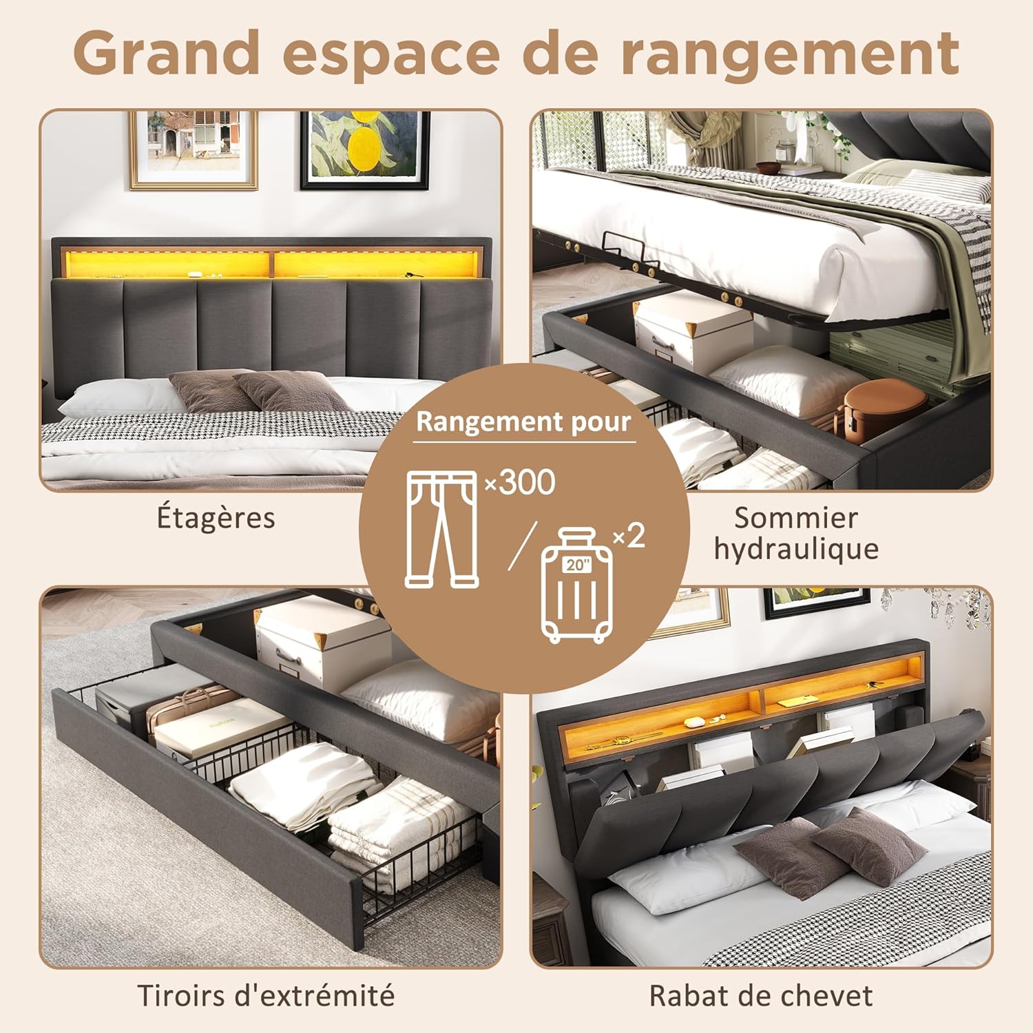 【STORAGE MULTIFONCTIONNEL】 : ce lit dispose d’une variété de fonctions d’espace de stockage, y compris un lit de rangement hydraulique, un tiroir de rangement 2 en 1 au bout du lit et une tête de lit. Ces espaces de rangement vous offrent des options de rangement pratiques qui vous permettent d’utiliser efficacement l’espace et de garder votre chambre bien rangée et organisée.