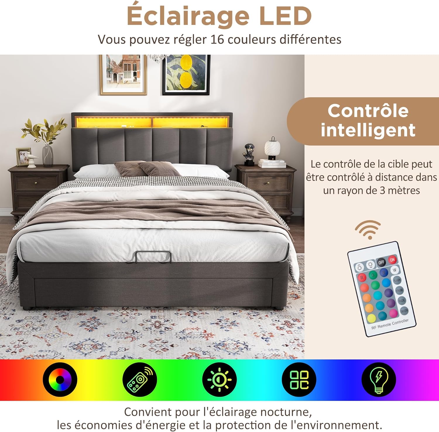 Tête de lit avec éclairage LED : la tête de lit sert de dossier confortable pour lire ou regarder la télévision. Un éclairage LED assure une lumière agréable, dont vous pouvez facilement régler la luminosité et la couleur par télécommande.