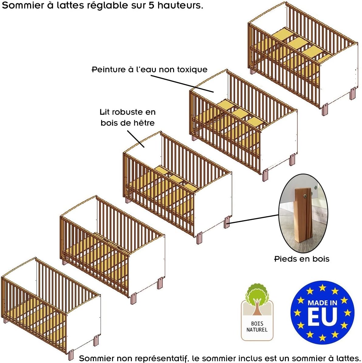 Il est équipé d’un sommier à lattes (pour une meilleure circulation de l’air) réglable en hauteur sur 5 positions (sur une plage de 25 cm). Il s’adapte donc à l’âge et à la taille de votre enfant, ce qui assure sa sécurité. Il assure également votre confort en vous évitant de trop vous baisser pour prendre/déposer votre enfant dans le lit.