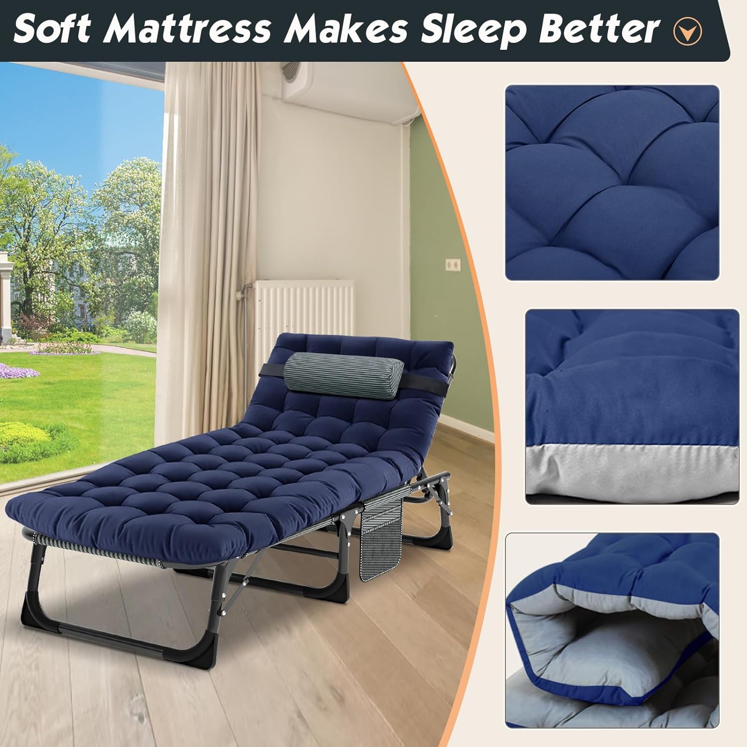 Sûre et confortable : notre chaise pliante réglable avec matelas est conçue avec des pieds antidérapants pour garantir la stabilité. Cet accessoire pliant dispose également d’un oreiller amovible et d’une poche latérale, qui offre un soutien confortable pour votre cou et votre tête pour vous aider à vous endormir rapidement.