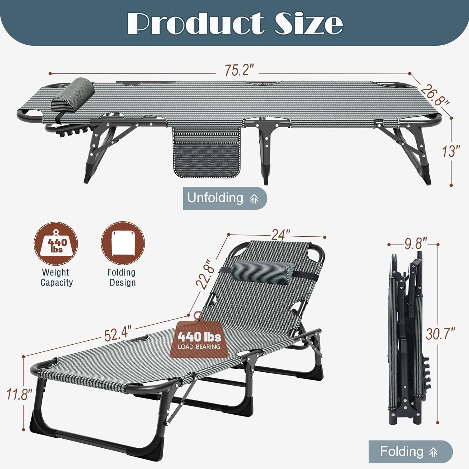 High Quality Materials : le bain de soleil est fabriqué en tissu Oxford 1200D double couche et en tube d’acier haute performance, la qualité est solide et durable, pas facile à déchirer et facile à nettoyer. Haute capacité de charge, avec une capacité de charge allant jusqu’à 200kg. Le lit pliant est renforcé à chaque articulation et peut facilement supporter le poids d’un adulte ou d’un enfant.
