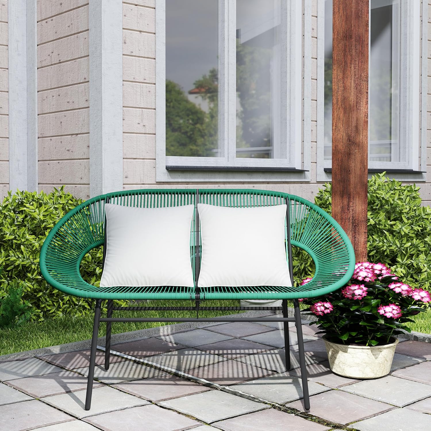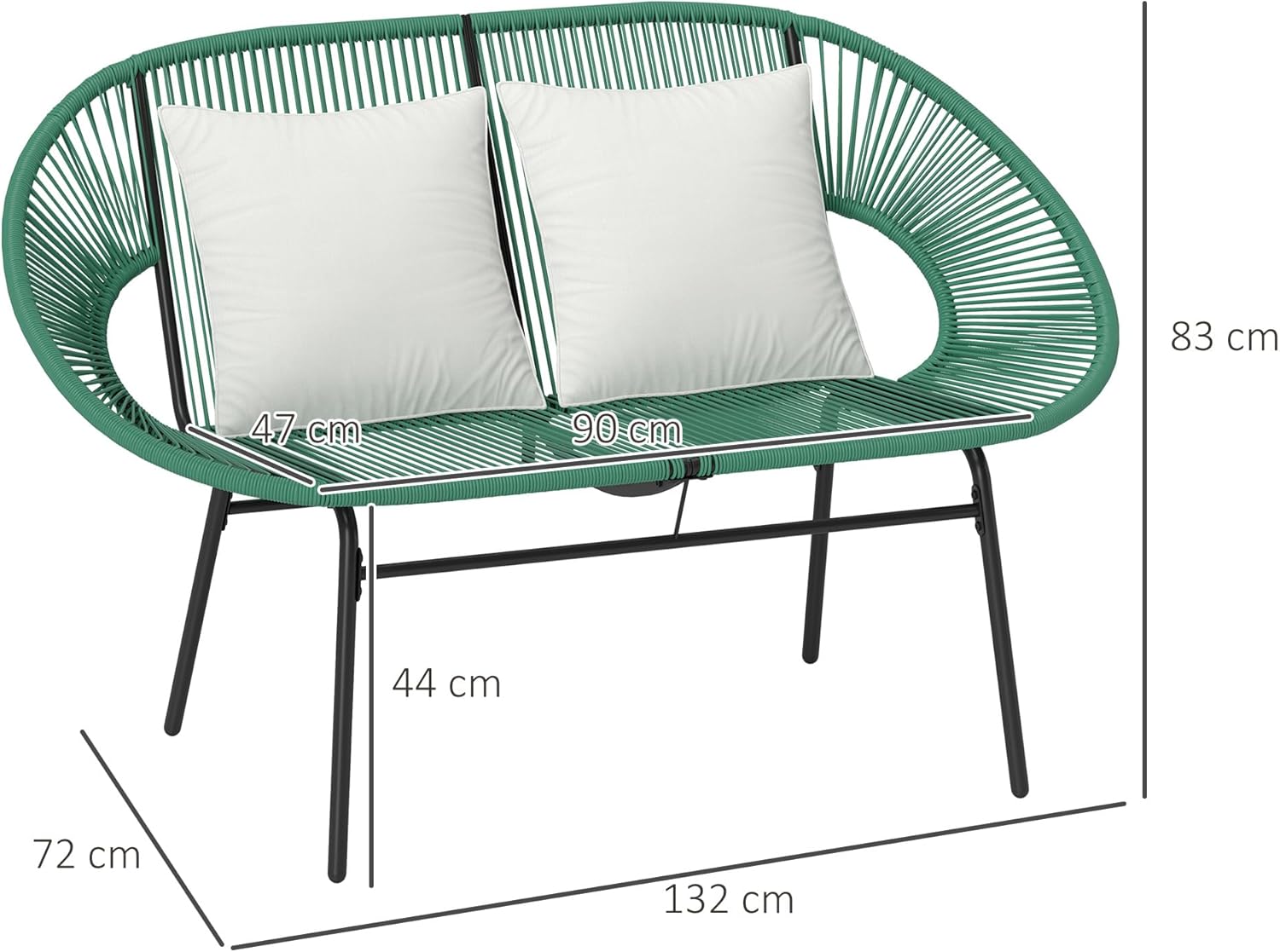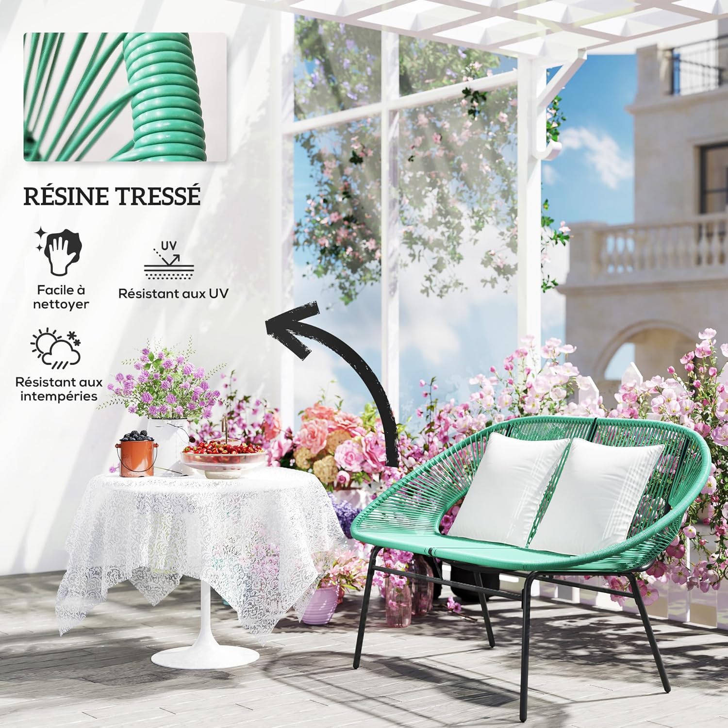 Banc de jardin au design moderne est idéal pour apporter un vent de fraicheur à votre extérieur Banc de 2 places en acier avec un revêtement en poudre pour une solidité supérieure et une utilisation quotidienne Enveloppé d’un cordage résistant aux UV et imperméable, la résine est très résistante aux conditions climatiques La large surface d’assise offre un espace spacieux pour 2 personnes sans se sentir à l’étroit Banc de terrasse avec des accoudoirs, un dossier haut et des coussins de dossier souples, assurant un soutien optimal pour la relaxation en plein air Idéal pour le patio, le jardin, la terrasse, le balcon, le bord de la piscine ou tout autre espace extérieur Certifications:EN581 Assemblage requis