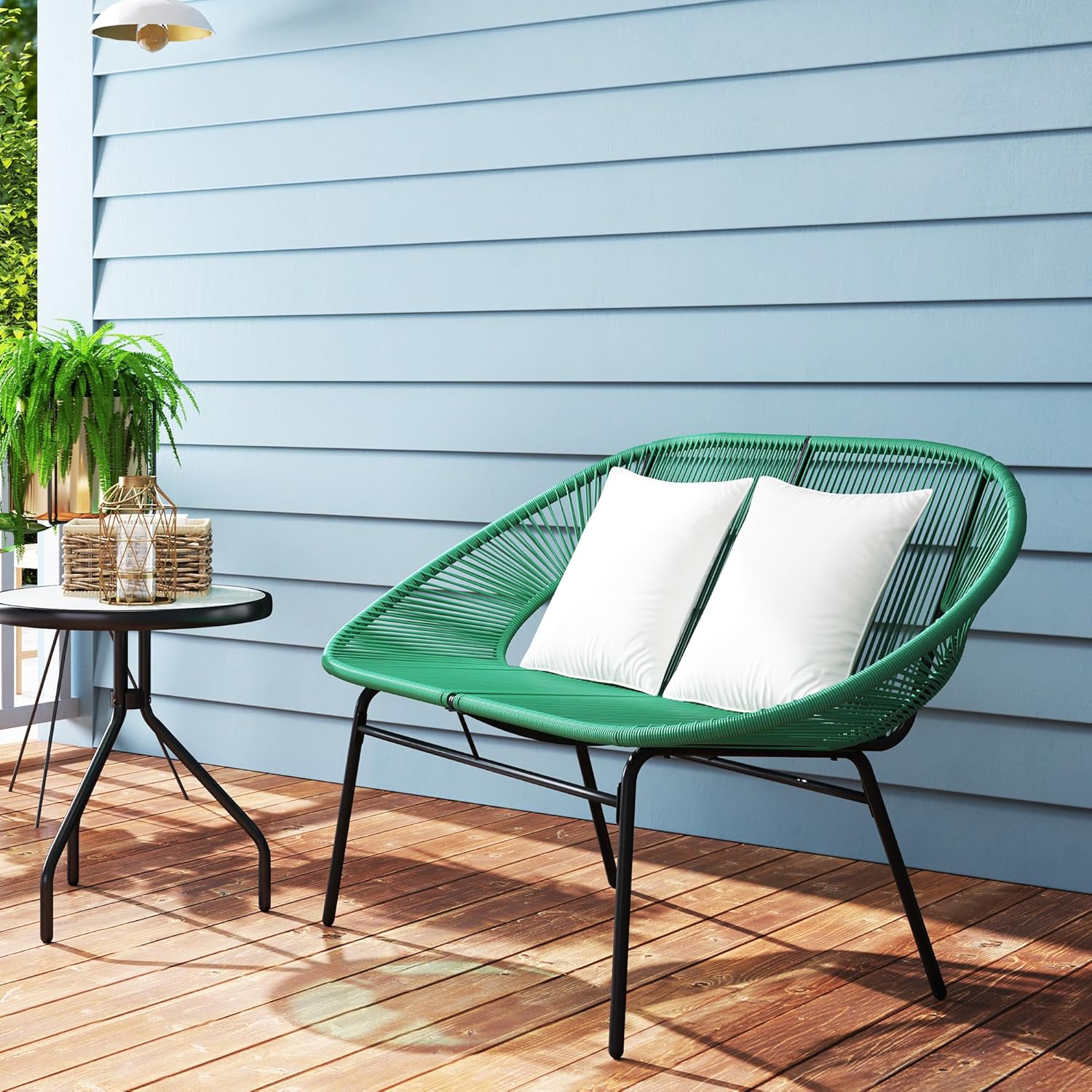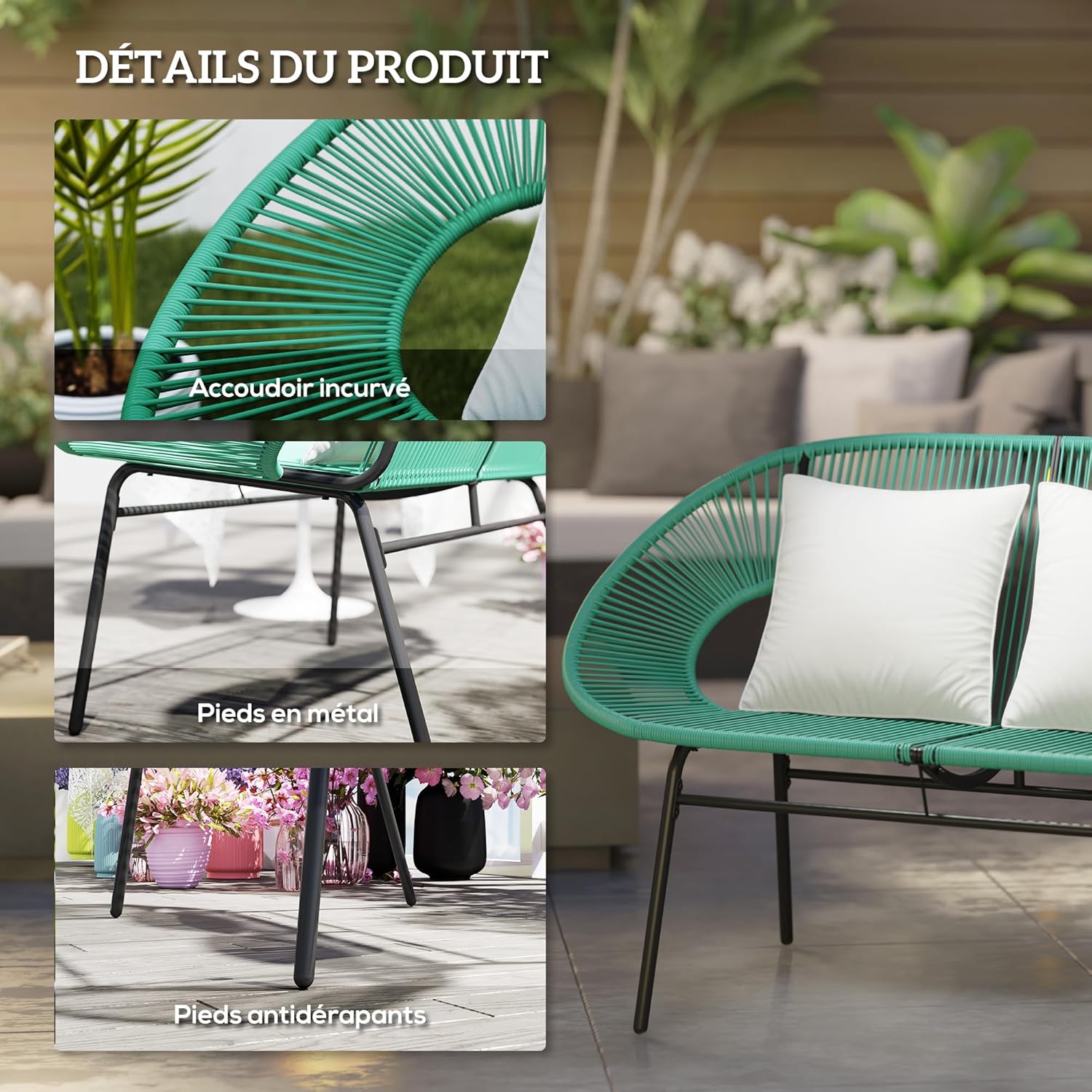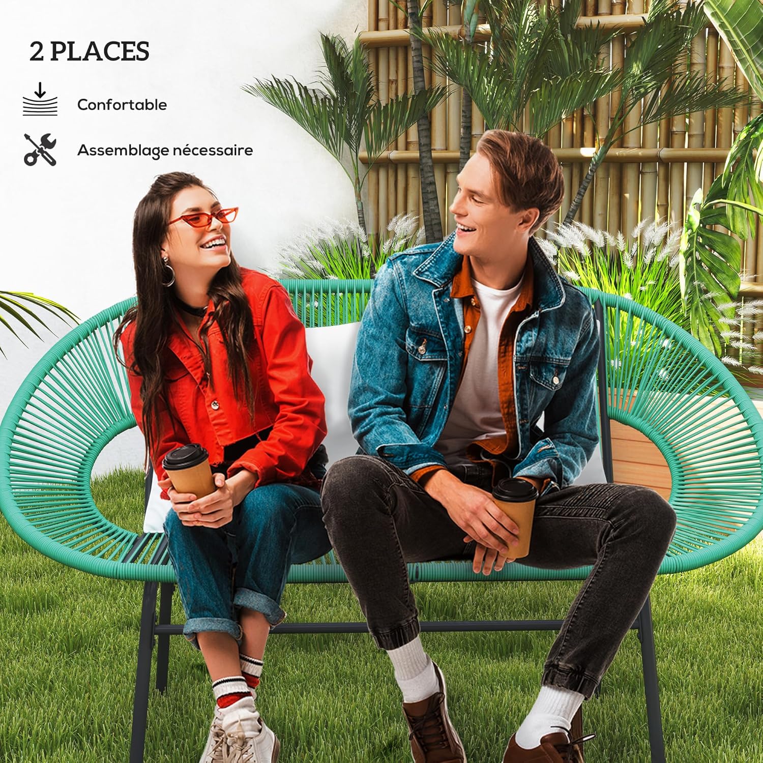 GRAND CONFORT : Le canapé d’extérieur peut accueillir confortablement 2 personnes. Son assise incurvée avec accoudoirs et 2 coussins inclus est idéale pour vous accorder un moment de détente en plein air