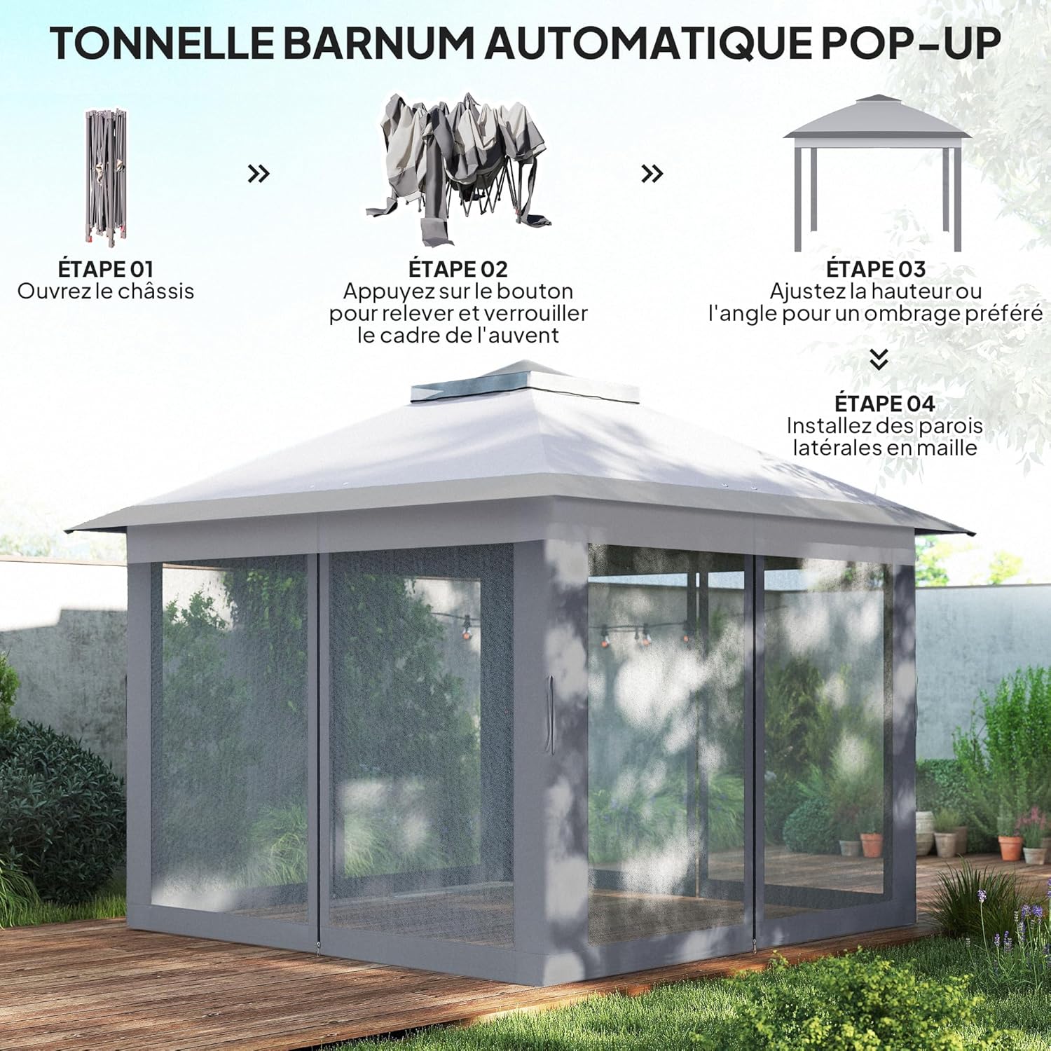 Cette splendide tonnelle pop-up pliante pourrait vous offrir de l’ombre ou vous le souhaitez ! C’est un barnum de jardin design et pratique idéal pour toute la famille ! Équipé d’un toit double et de 4 moustiquaires, vous et vos invités seront parfaitement protégés contre le soleil et contre les insectes tout en profitant d’un air respirable et agréable.