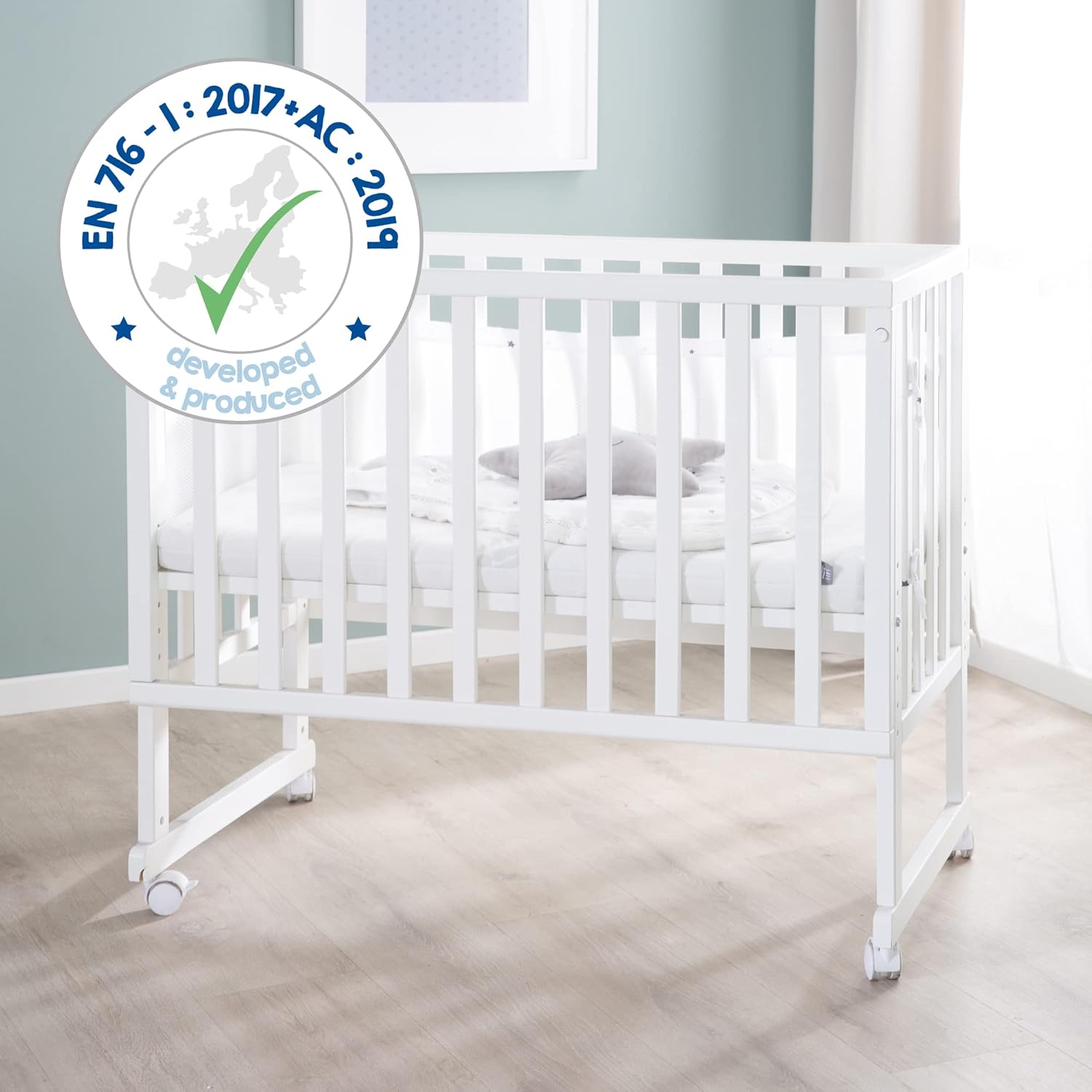 SÉCURITÉ & FIABILITÉ : le lit de bébé répond à la norme de sécurité actuelle EN 1130:2019 – Barrière comme protection contre le basculement – Sangles de sécurité pour la fixation incluses – Berceau cododo protégé par brevet