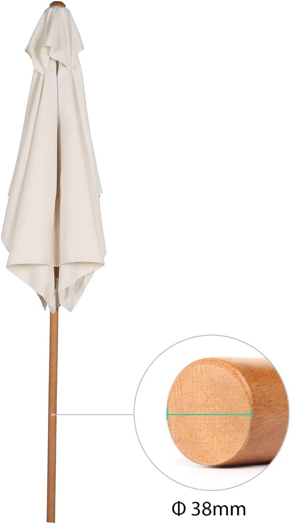 Dimensions & Matériau : 200×150 cm (hauteur 235 cm), mât en bois massif Ø38 mm. Toile polyester 180g/m².