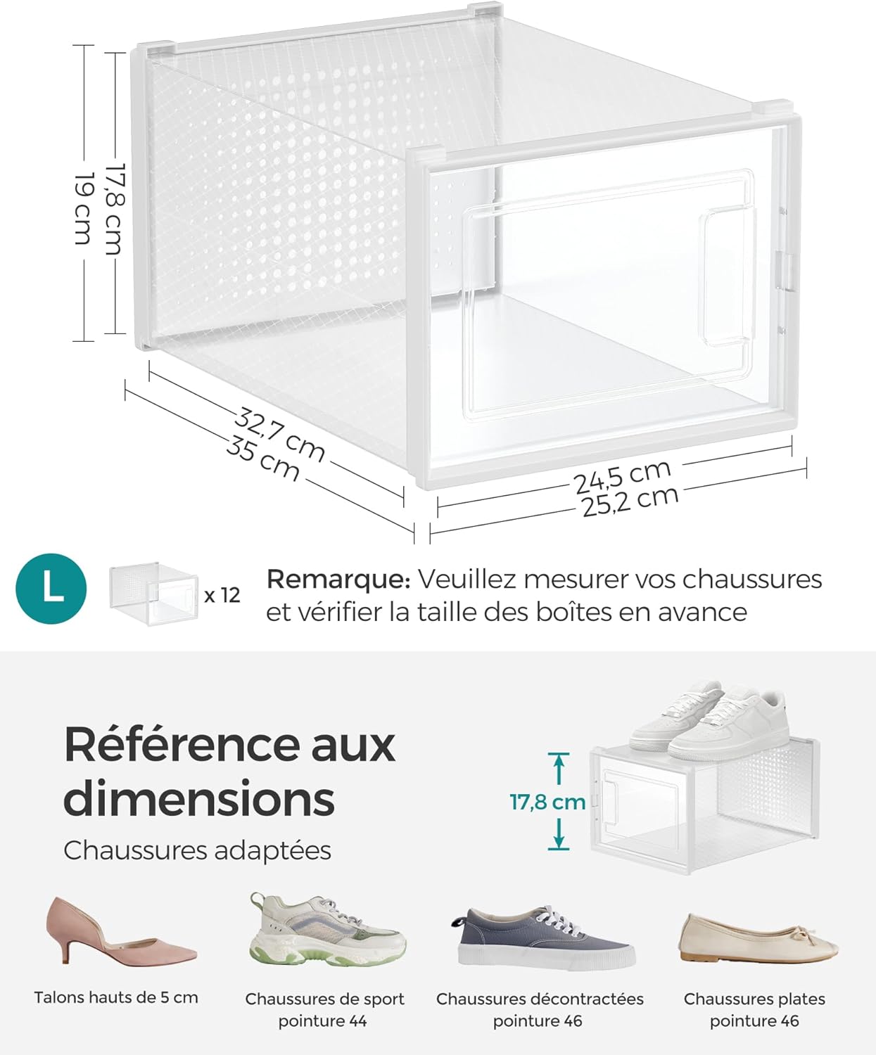 Vérifiez la pointure de vos chaussures et les dimensions des boîtes avant l’achat.