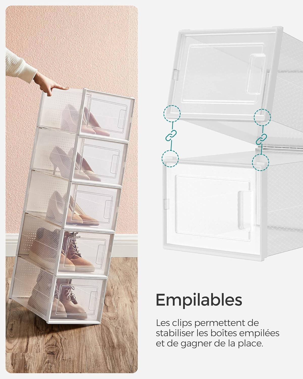 [Quelle paire voulez-vous ?] Les boîtes transparentes vous permettent de vite repérer la paire de chaussures. Grâce à la porte frontale, les chaussures sont facilement accessibles
