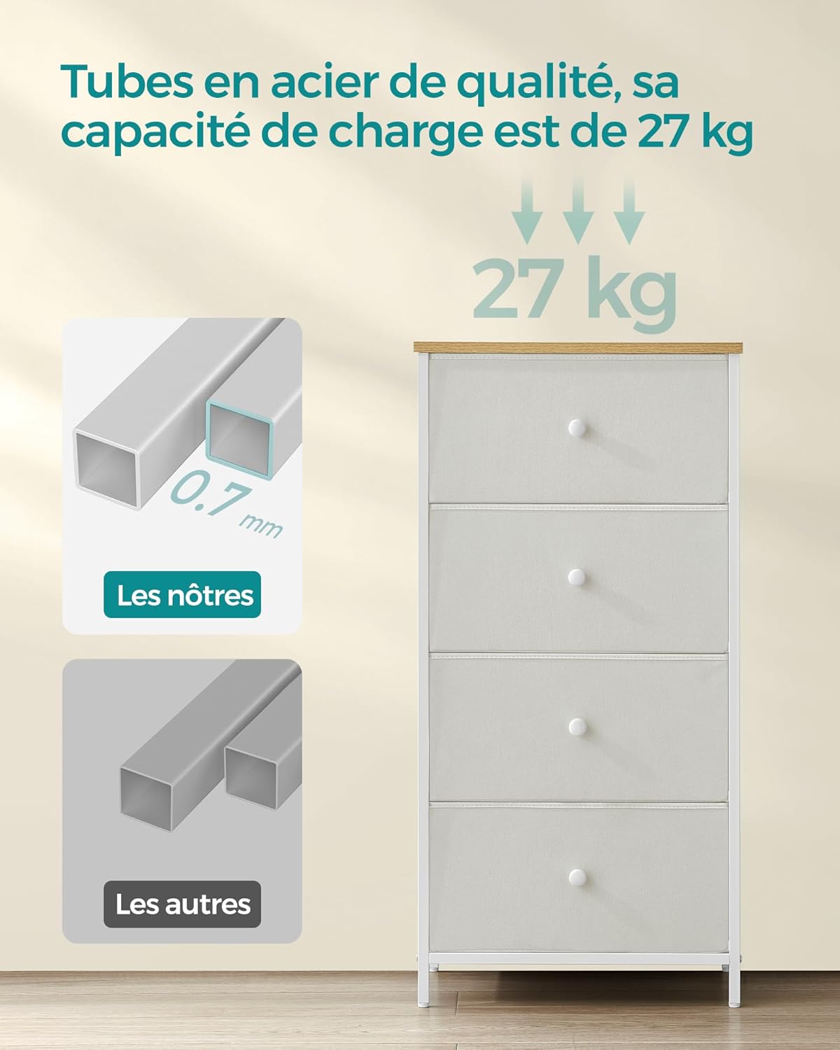 [Ce que vous obtenez] Une commode avec 4 tiroirs qui embellit votre intérieur. Elle est légère et facile à déplacer. Elle est dotée de 4 pieds réglables et elle est simple à monter. Voilà un bon moyen de garder votre maison propre et bien rangée