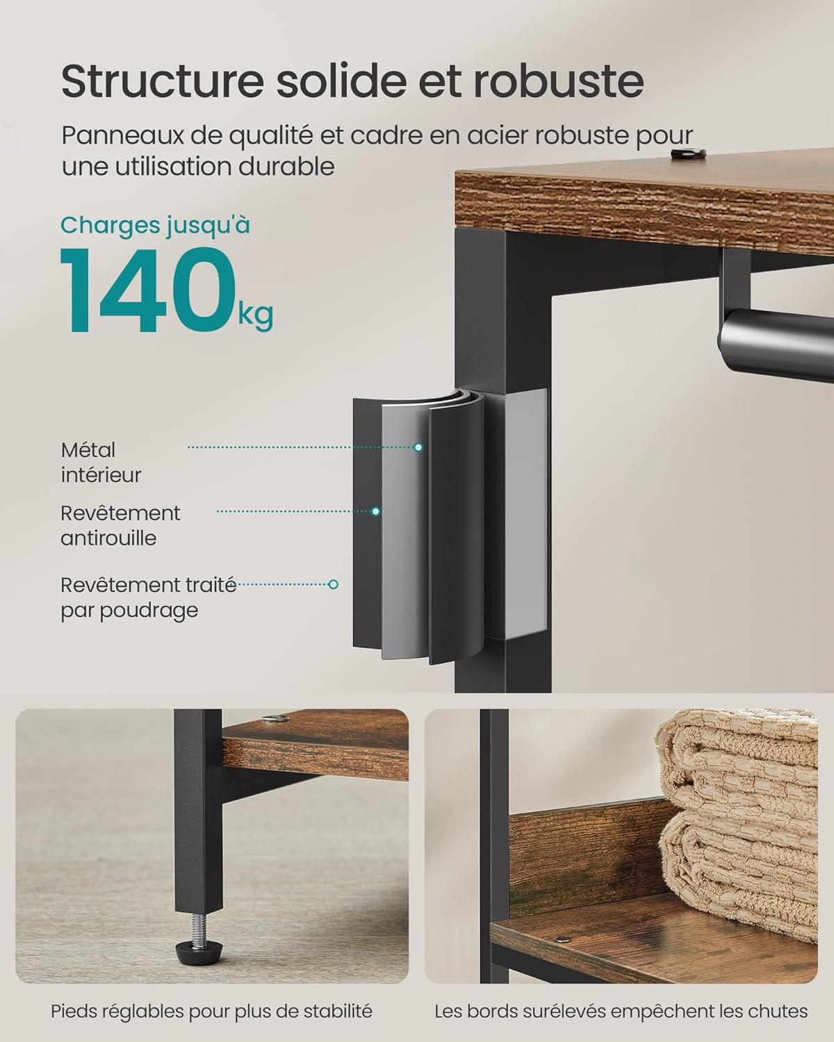 【ROBUSTE ET FIABLE】Construit avec un cadre en acier robuste et des panneaux d’aggloméré épais, ce portant à vêtements supporte sans problème jusqu’à 140 kg. Accrochez vos lourdes vestes d’hiver en toute confiance !