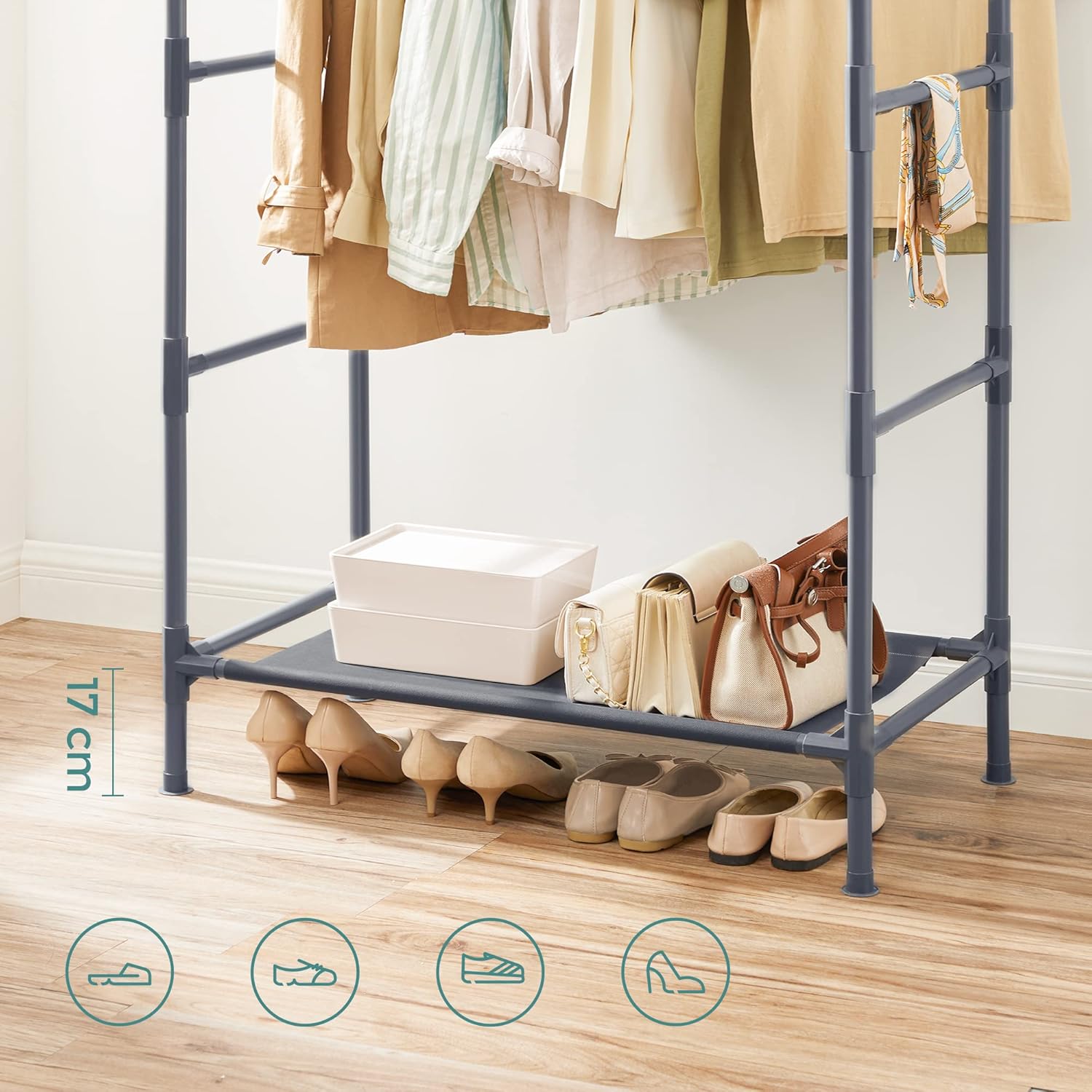 Pour des matins plus calmes : Le matin, vous perdez combien de temps à choisir et à assortir vos vêtements ? Il est grand temps d’opter pour ce porte-manteau gris pratique ! Les 2 barres de suspension robustes et son étagère vont vous simplifier la vie ! Avec ce portant, profitez-en pour mettre de l’ordre dans vos chemises, vos robes, vos manteaux, vos sacs et même vos chaussures. Assortissez tout à l’avance pour mieux commencer la journée !