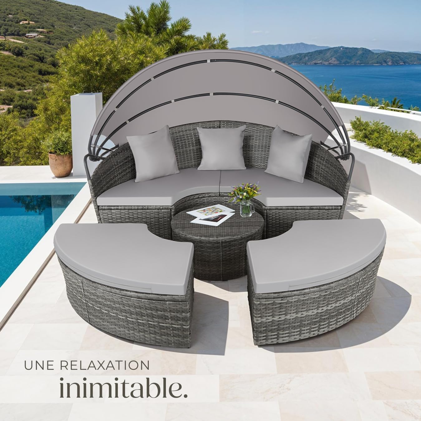 VERSATILITÉ INÉGALÉE DANS VOTRE JARDIN : Transformez votre extérieur en un havre de paix avec notre salon de jardin modulable. Ce fauteuil salon élégant se mue aisément en un confortable bain de soleil jardin extérieur, offrant le meilleur des 2 mondes. Son design contemporain et luxueux fait de cet ensemble meuble salon un choix idéal pour ceux qui recherchent à la fois esthétisme et fonctionnalité. Avec ce salon, créez le coin parfait pour vous détendre ou accueillir vos invités en plein air.
