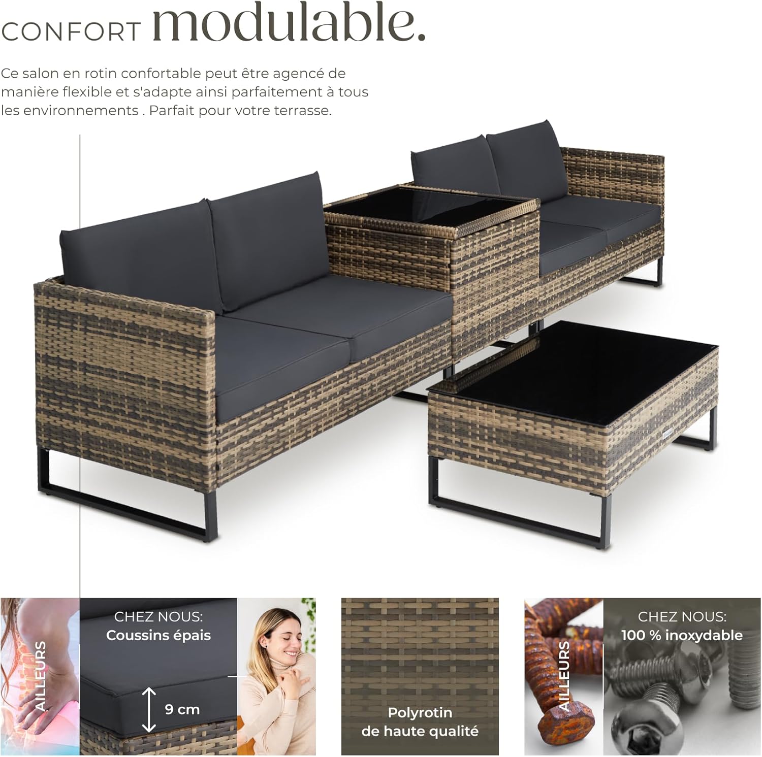 Points Forts Éléments modulable selon vos envies Tressage en polyrotin résistant aux UV Structure en acier avec pieds en plastique réglables en hauteur Rembourrage de l’assise et du dossier très confortable Housses imperméables et lavables Table avec plateau amovible en verre de sécurité Grand coffre de rangement avec surface en verre Montage facile
