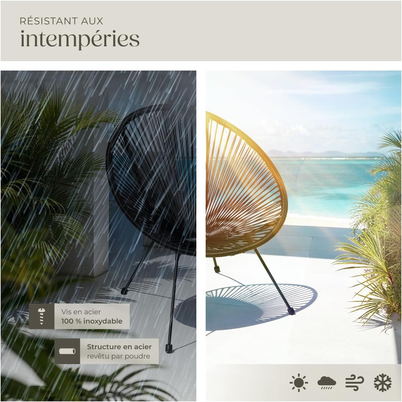 VERSATILITÉ ET ÉLÉGANCE : Notre salon de jardin n’est pas seulement un ensemble de mobilier extérieur; il est conçu pour embellir aussi bien votre intérieur. La table de jardin avec son élégant plateau en verre et les fauteuils au design Acapulco s’adaptent à tous les décors. Faciles à déplacer grâce à leur poids plume, ils invitent à la convivialité où que vous soyez, en intérieur comme en extérieur.