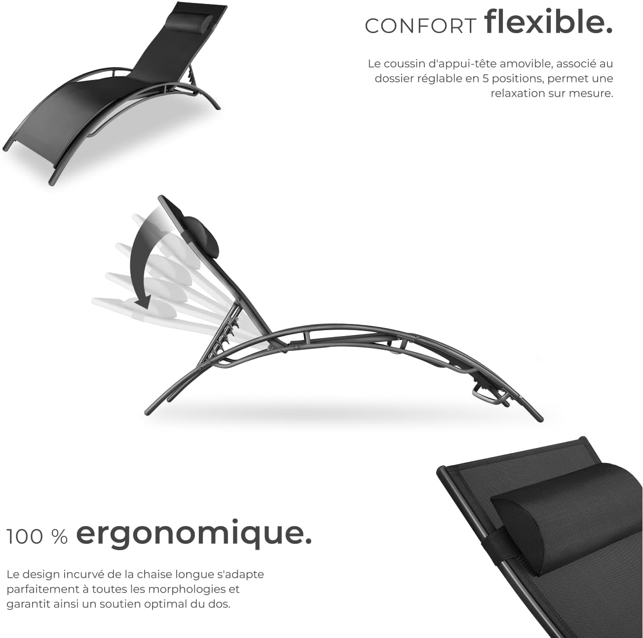 DOSSIER AJUSTABLE POUR UN CONFORT MAXIMAL: Trouvez votre angle idéal pour la relaxation avec le dossier réglable sur 5 positions. Que vous soyez en mode transat jardin pour une séance de lecture ou en position bain de soleil pour une sieste, ces chaises longues jardin extérieur s’adaptent à toutes vos envies, offrant une expérience personnalisée de détente en plein air.