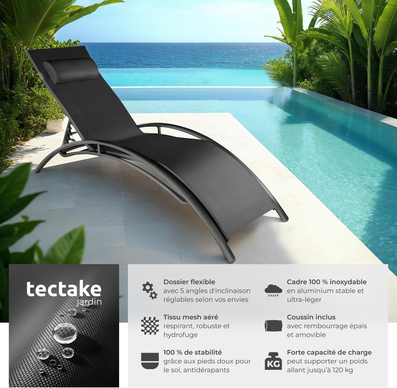 Points forts Chaises longues attrayantes avec un grand confort de couchage Dossier réglable sur 5 positions Résiste aux intempéries Appui-tête moelleux et amovible Capuchons en plastique doux pour le sol Grande stabilité Montage et démontage rapides Poids plume grâce à une construction légère