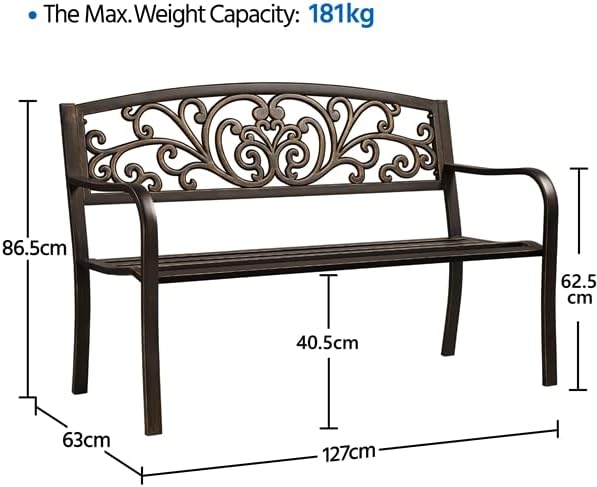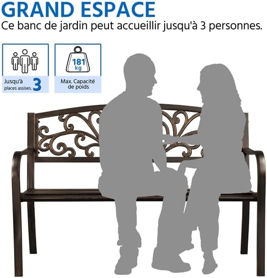 Cadre métallique : La construction métallique permet la robustesse de ce produit. D’une armature solide, ce banc d’extérieur peut supporter le poids jusqu’à 181kg