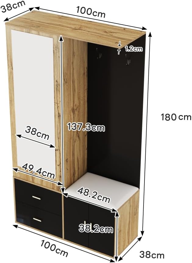 【Zone de suspension ouverte】 : La première section comprend une zone ouverte avec deux crochets pour manteaux et un cintre rétractable, parfait pour suspendre des chapeaux, des écharpes et d’autres accessoires. Les cintres extensibles offrent un espace supplémentaire pour suspendre les vêtements, garantissant ainsi une zone d’entrée bien rangée.