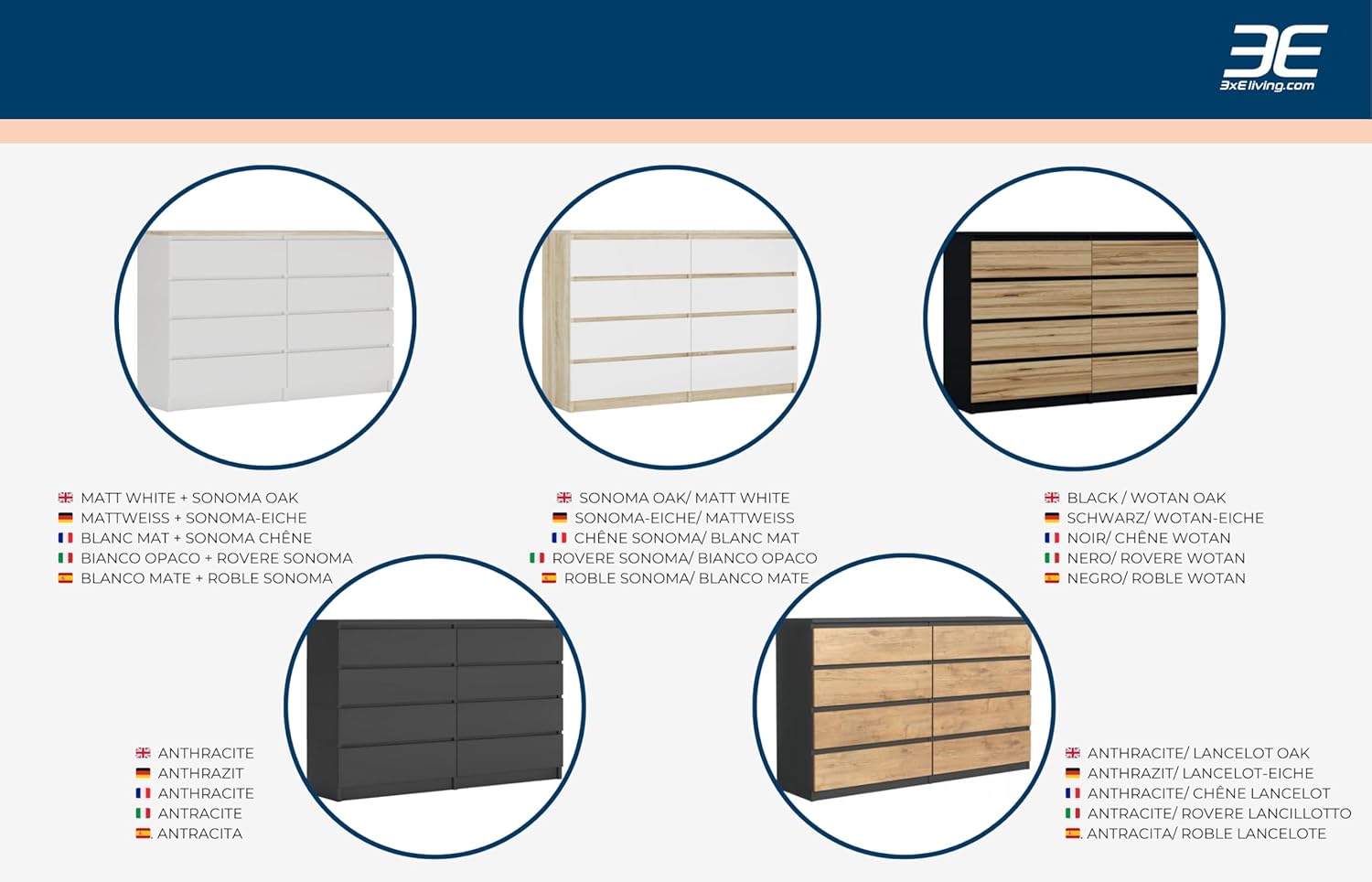 Il est facile d’assembler la commode soi-même à l’aide des instructions de montage fournies. Veuillez noter que la reproduction des couleurs des images du produit sur votre écran peut différer légèrement de la réalité.