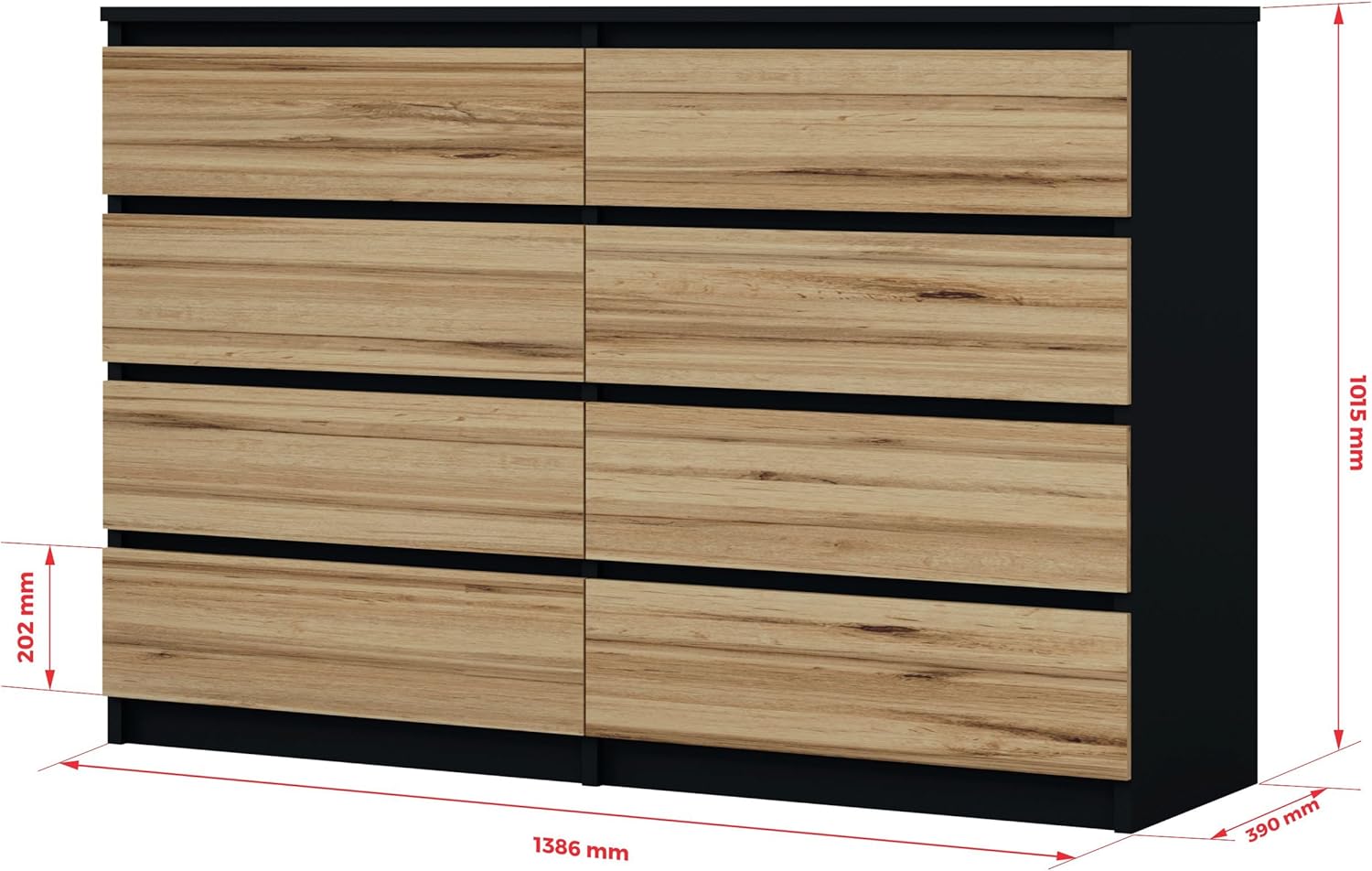 Caractéristiques techniques: longueur: 140 cm, hauteur : 101 cm, profondeur : 39 cm, nombre de tiroirs: 8 tiroirs. Matériel : Corps et façades – panneaux de particules mélaminés, épaisseur 16 mm. Bords – finis en plastique ABS. Nous envoyons le meuble de rangement chambre au client en 2 colis.