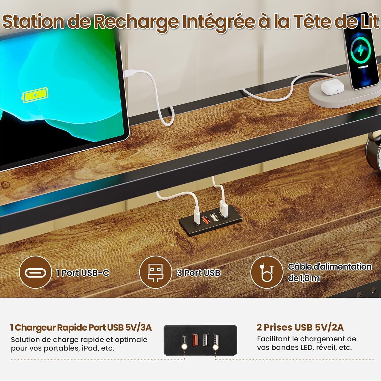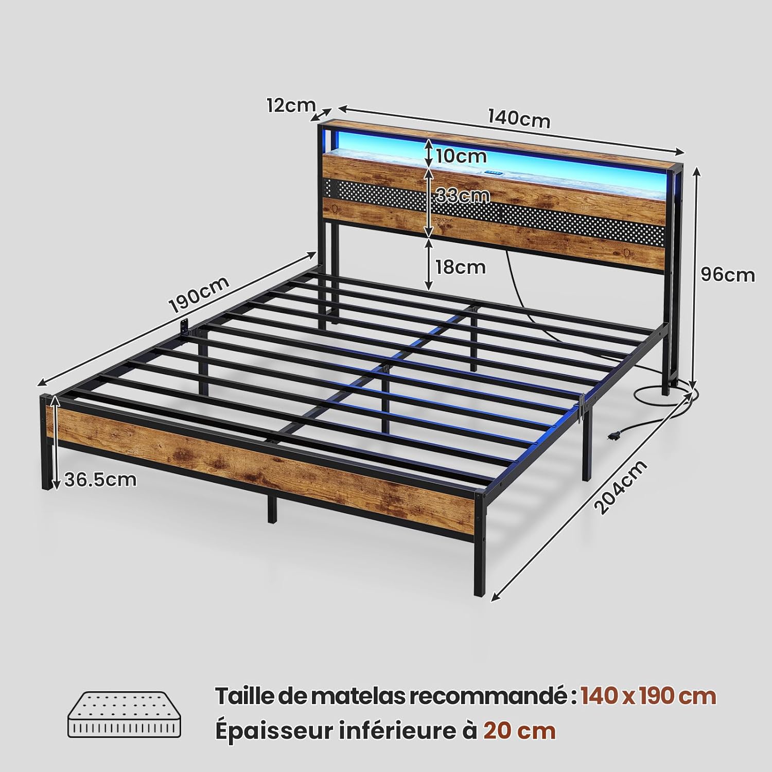 Cadre de Lit 140x190cm avec tête LED et 3 Ports USB Lit 2 Personnes