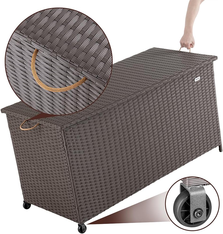 Matériau : Polyrotin 420 Litres Résistant UV Équipé de : 2 roues pour un déplacement facile Coffre de jardin rotin synthétique imperméable Structure résistante aux agents atmosphériques couvercle Avec fermeture stable anti-poussière Capacité : Spacieuse pour outils et coussins Facile à monter Peu d’entretien Dimensions totales : 121 x 55 x 60 cm (L x P x H) Résistance à la traction Jusqu’à 9 kg Poignée de transport oui