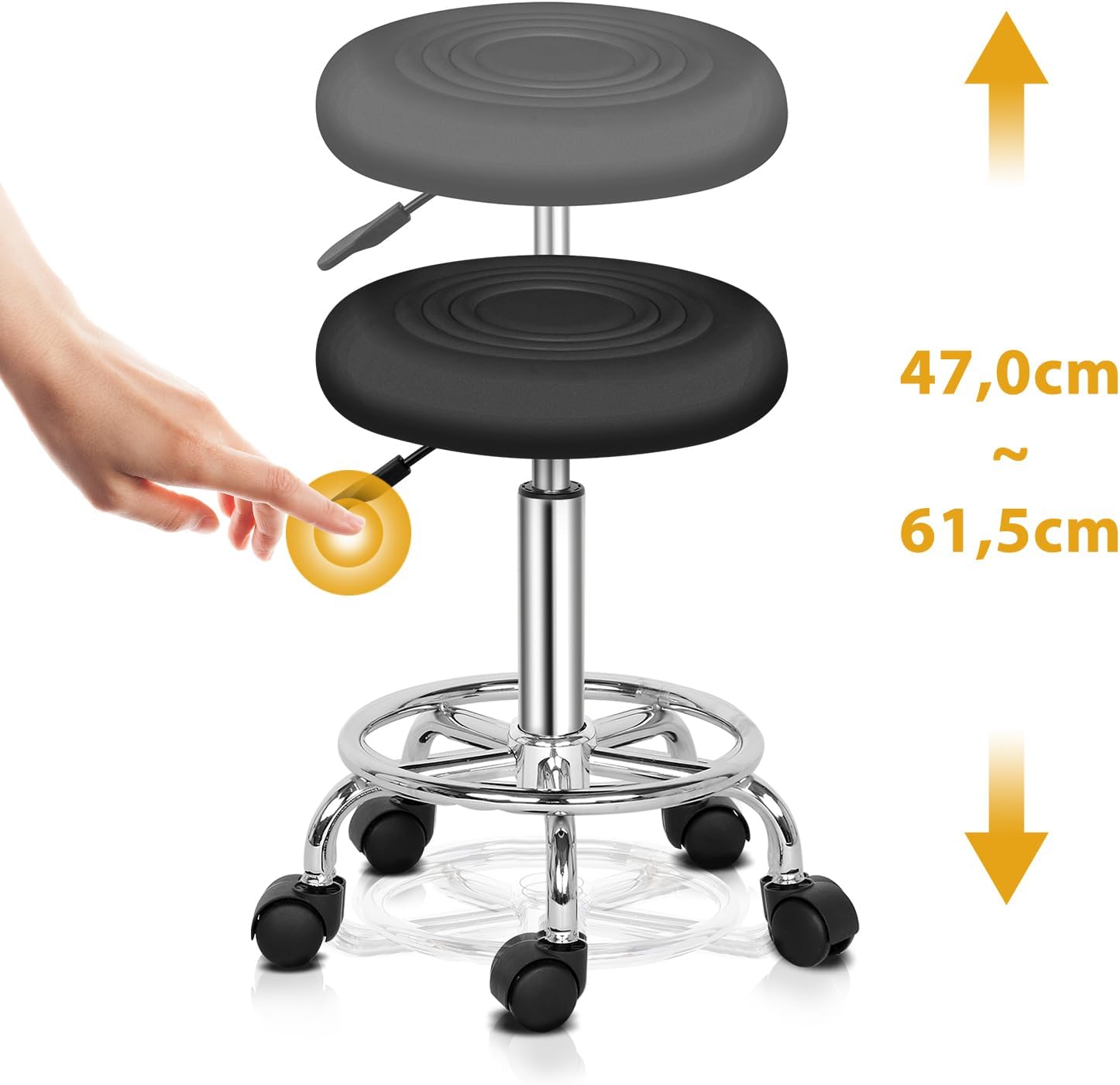 Grande capacité de charge et durabilité : le tabouret à roulettes peut supporter un poids maximal de 150 kg. Avec une hauteur réglable de 50 à 64,5 cm, il convient à la plupart des gens.