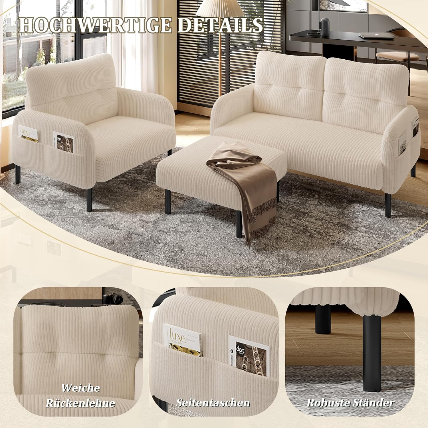 【Ensemble polyvalent de trois pièces】 : composé d’un canapé deux places, d’un fauteuil et d’un repose-pieds, il s’adapte à tous les intérieurs. Parfait pour le salon, la chambre ou un petit appartement, il s’intègre parfaitement à tous les environnements.