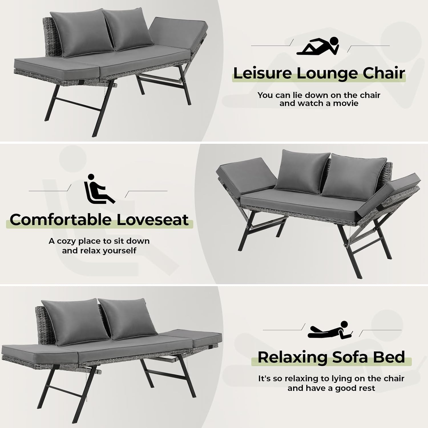 【Conception d’accoudoir réglable】Les accoudoirs des deux côtés du banc de jardin sont conçus pour être flexibles. Les panneaux latéraux peuvent être rabattus sans trop d’effort. Pour ce faire, retirez les deux goupilles de verrouillage fixées hors de la fixation et le canapé double peut être transformé en un canapé-lit de 176 cm de long. Les accoudoirs peuvent être rabattus vers l’extérieur pour que vous puissiez également utiliser le canapé comme une chaise longue confortable. Que vous souhaitiez vous asseoir, vous adosser ou dormir, le canapé répondra toujours parfaitement à vos besoins.