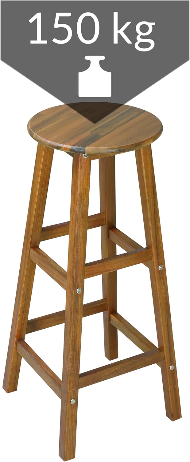 La table haute de 75 x 75 cm ainsi que les tabourets en bois d’acacia massif sont particulièrement robustes et stables. Les traverses en bois stabilisent davantage les chaises hautes et servent de repose-pieds.