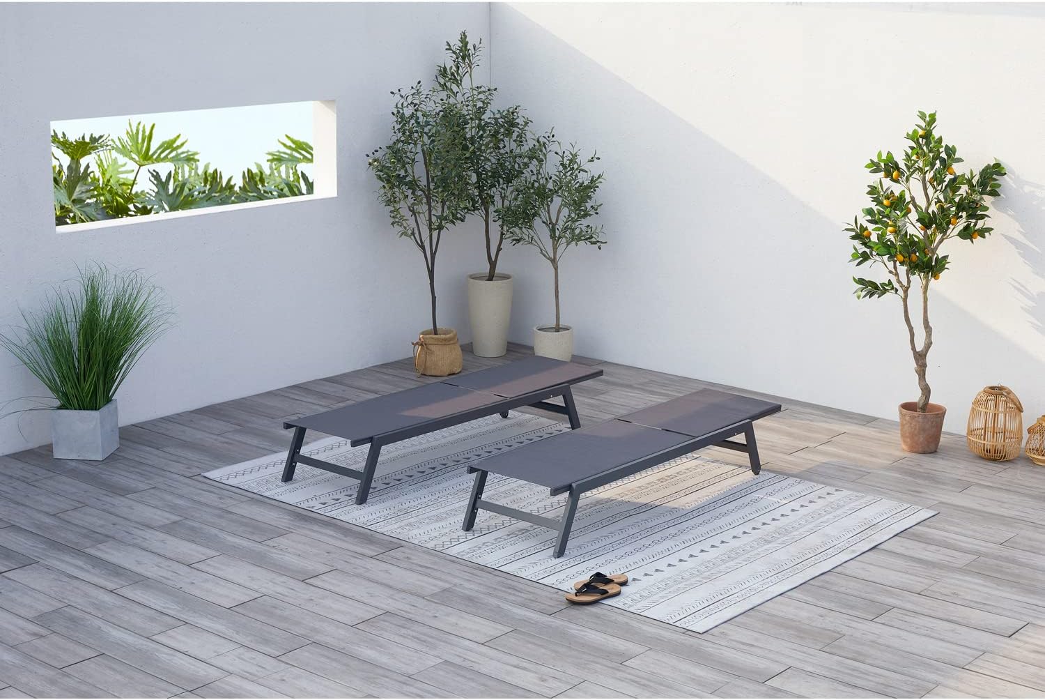 STRUCTURE EN ALUMINIUM LÉGÈRE ET SOLIDE – Chaque chaise longue supporte jusqu’à 130 kg grâce à un cadre stable et résistant à la corrosion, aux UV et aux intempéries.