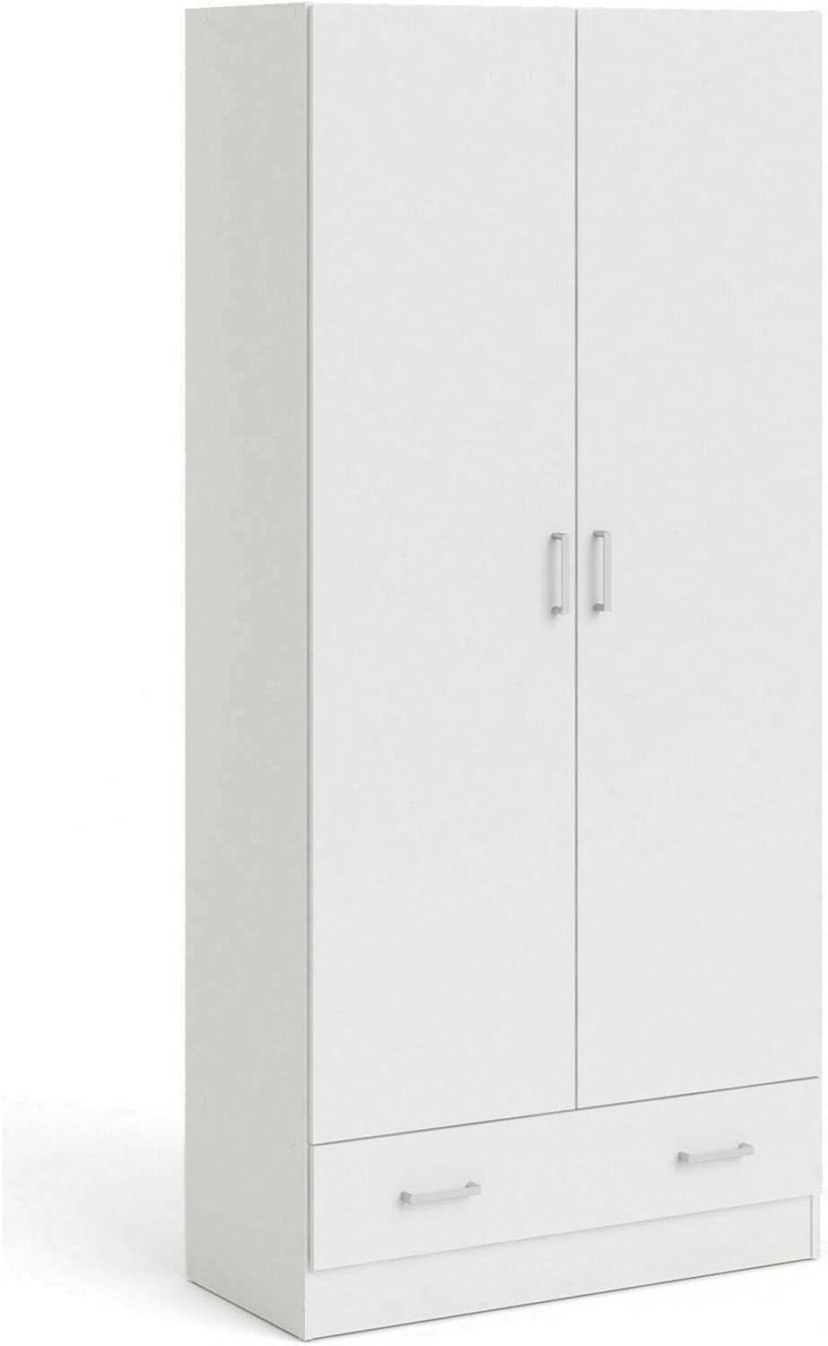 Armoire penderie à deux portes battantes et un tiroir extérieur dans la partie inférieure, entièrement de couleur blanche. L’intérieur est structuré avec trois étagères pour pouvoir ranger de manière discrète et ordonnée vos vêtements. Dans le tiroir inférieur, il est possible de ranger les objets de petite taille, aussi bien le tiroir que les lenades sont équipés de poignées pratiques qui facilitent son ouverture. Entièrement fabriqué en stratifié, il est résistant aux chocs et aux rayures et est durable dans le temps. Dimensions en cm : 79 x 170 x 35 cm