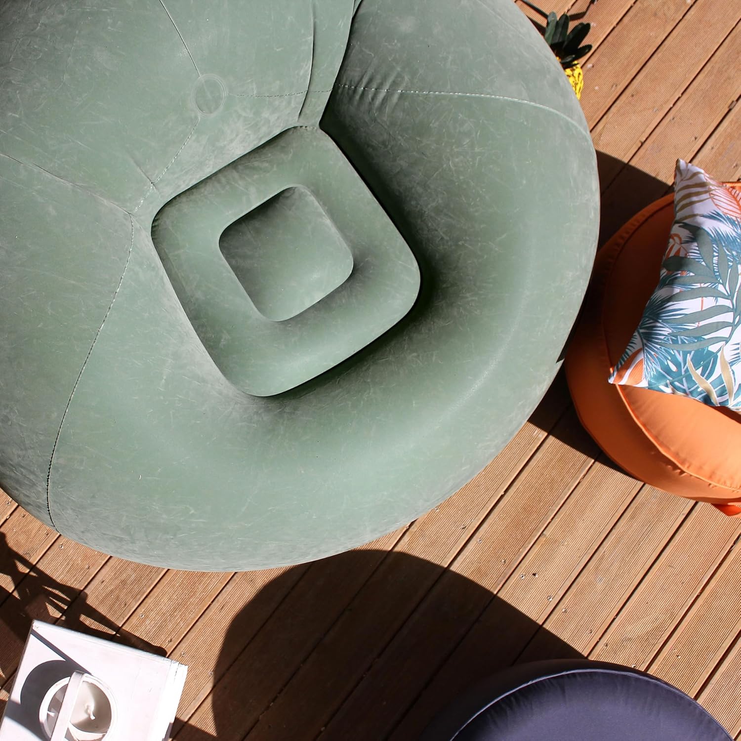Ce fauteuil d’extérieur Gonflable, Vert Argile, mesure 100cm de largeur sur 100cm de hauteur. Sa finition 100% PVC flocké, déperlante et anti-UV lui permet de résister aux intempéries tout en gardant un toucher doux et agréable. Conçu pour vous apporter confort et bien-être au soleil. Son poids est de 1,28kg.