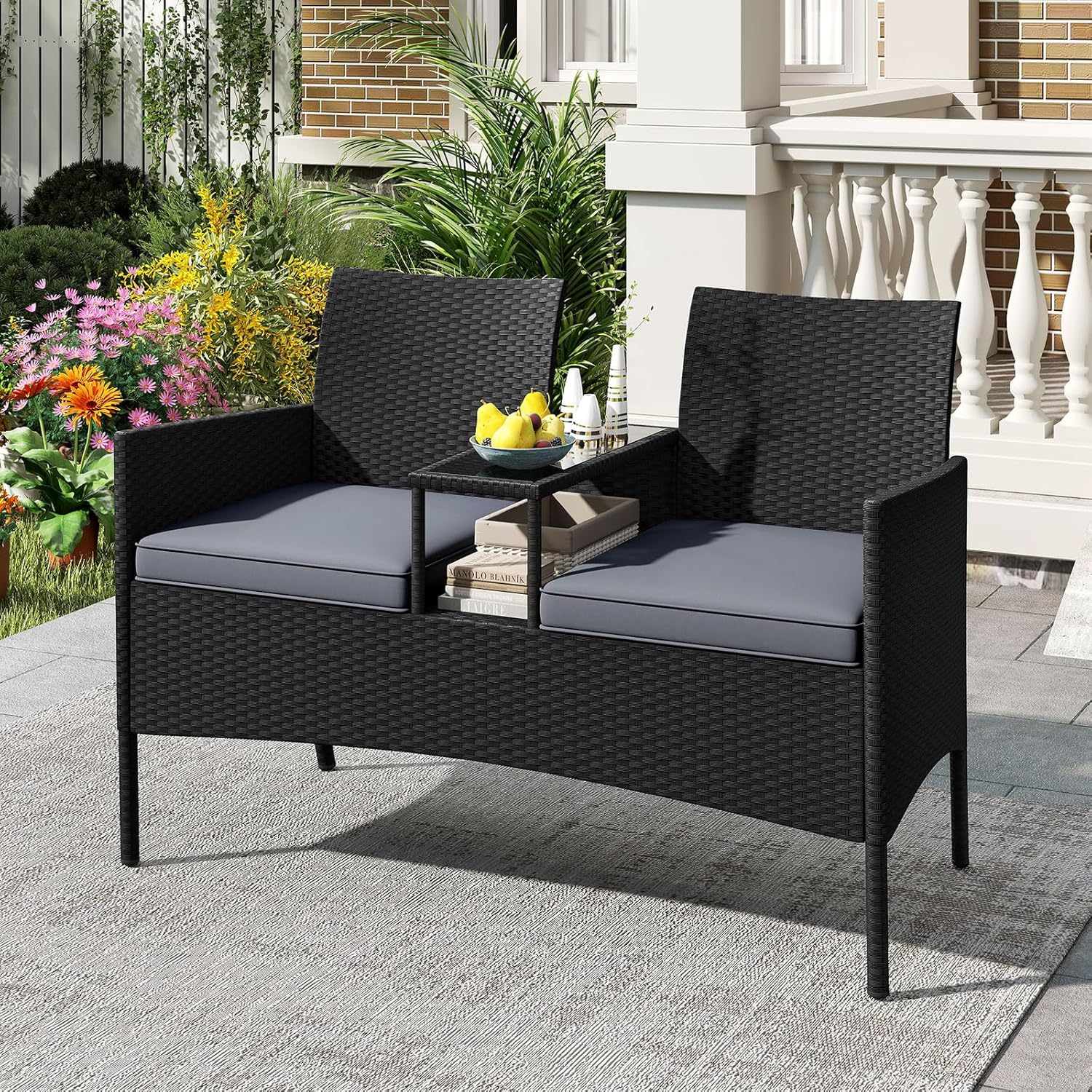Doté d’une table basse intégrée avec un plateau en verre trempé facile à nettoyer et d’un espace de rangement sur 2 niveaux, le banc d’extérieur 2 places tient tout ce dont vous avez besoin à portée de main. Fabriqué en rotin PE tressé à la main, il offre une excellente respirabilité, résistant au soleil et à la décoloration, assurant une durabilité à long terme pour une utilisation en extérieur. Les coussins souples et les dossiers incurvés offrent un confort exceptionnel et un soutien ergonomique, tandis que le cadre en métal robuste assure la stabilité. Cet ensemble de conversation est parfait pour les conversations intimes avec des amis ou la famille dans les patios, les patios, ou au bord de la piscine.